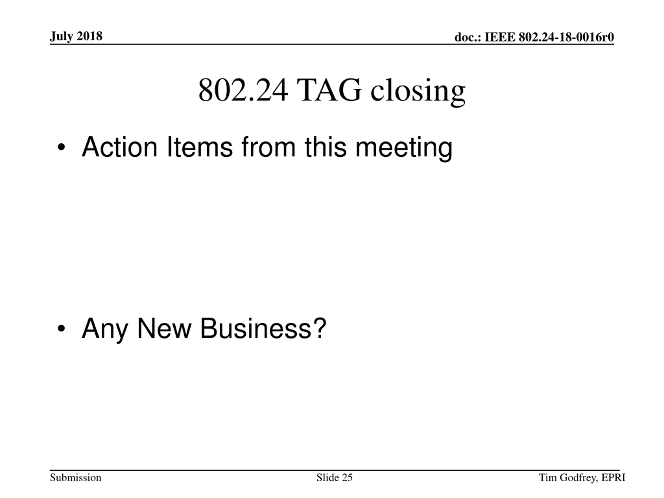 July 2018 doc.: IEEE 802.24-18-0016r0 802.24 TAG closing Action Items from this meeting Any New Business? Submission Slide 25 Tim Godfrey, EPRI