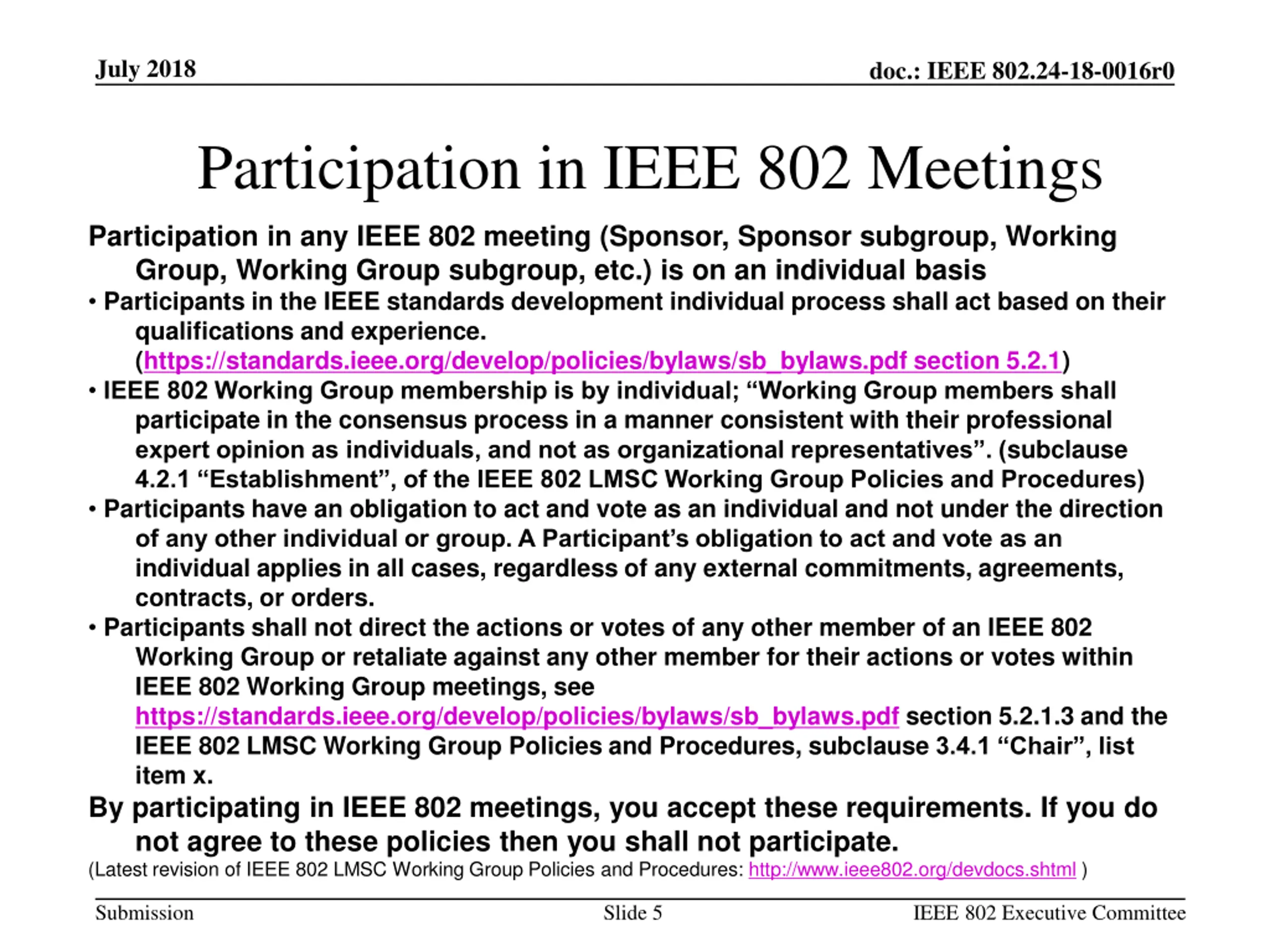 July 2018 doc.: IEEE 802.24-18-0016r0 Participation in IEEE 802 Meetings Participation in any IEEE 802 meeting (Sponsor, Sponsor subgroup, Working Group, Working Group subgroup, etc.) is on an individual basis Participants in the IEEE standards development individual process shall act based on their qualifications and experience. (https://standards.ieee.org/develop/policies/bylaws/sb_bylaws.pdf section 5.2.1) IEEE 802 Working Group membership is by individual; Working Group members shall participate in the consensus process in a manner consistent with their professional expert opinion as individuals, and not as organizational representatives . (subclause 4.2.1 Establishment , of the IEEE 802 LMSC Working Group Policies and Procedures) Participants have an obligation to act and vote as an individual and not under the direction of any other individual or group. A Participant s obligation to act and vote as an individual applies in all cases, regardless of any external commitments, agreements, contracts, or orders. Participants shall not direct the actions or votes of any other member of an IEEE 802 Working Group or retaliate against any other member for their actions or votes within IEEE 802 Working Group meetings, see https://standards.ieee.org/develop/policies/bylaws/sb_bylaws.pdf section 5.2.1.3 and the IEEE 802 LMSC Working Group Policies and Procedures, subclause 3.4.1 Chair , list item x. By participating in IEEE 802 meetings, you accept these requirements. If you do not agree to these policies then you shall not participate. (Latest revision of IEEE 802 LMSC Working Group Policies and Procedures: http://www.ieee802.org/devdocs.shtml ) Submission Slide 5 IEEE 802 Executive Committee