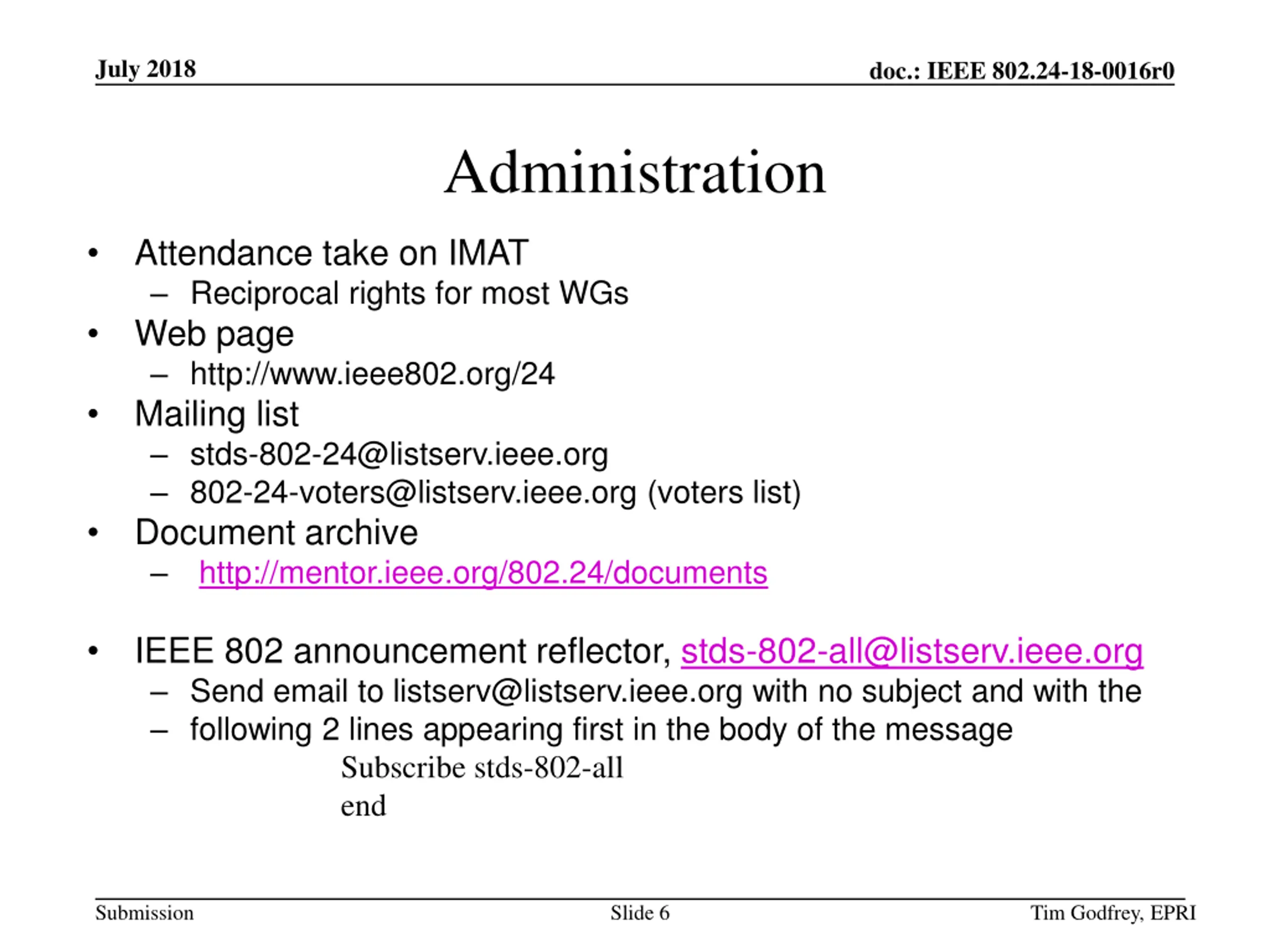 July 2018 doc.: IEEE 802.24-18-0016r0 Administration Attendance take on IMAT Reciprocal rights for most WGs Web page http://www.ieee802.org/24 Mailing list stds-802-24@listserv.ieee.org 802-24-voters@listserv.ieee.org (voters list) Document archive http://mentor.ieee.org/802.24/documents IEEE 802 announcement reflector, stds-802-all@listserv.ieee.org Send email to listserv@listserv.ieee.org with no subject and with the following 2 lines appearing first in the body of the message Subscribe stds-802-all end Submission Slide 6 Tim Godfrey, EPRI