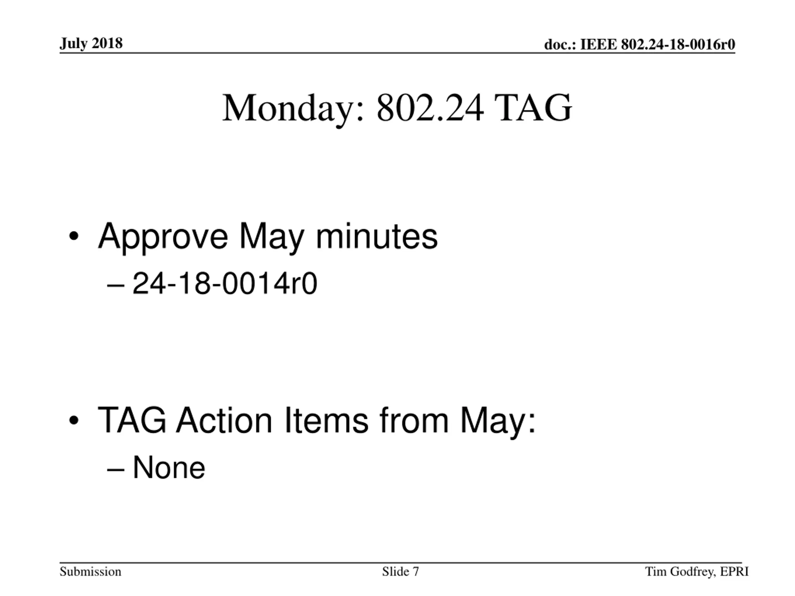 July 2018 doc.: IEEE 802.24-18-0016r0 Monday: 802.24 TAG Approve May minutes 24-18-0014r0 TAG Action Items from May: None Submission Slide 7 Tim Godfrey, EPRI