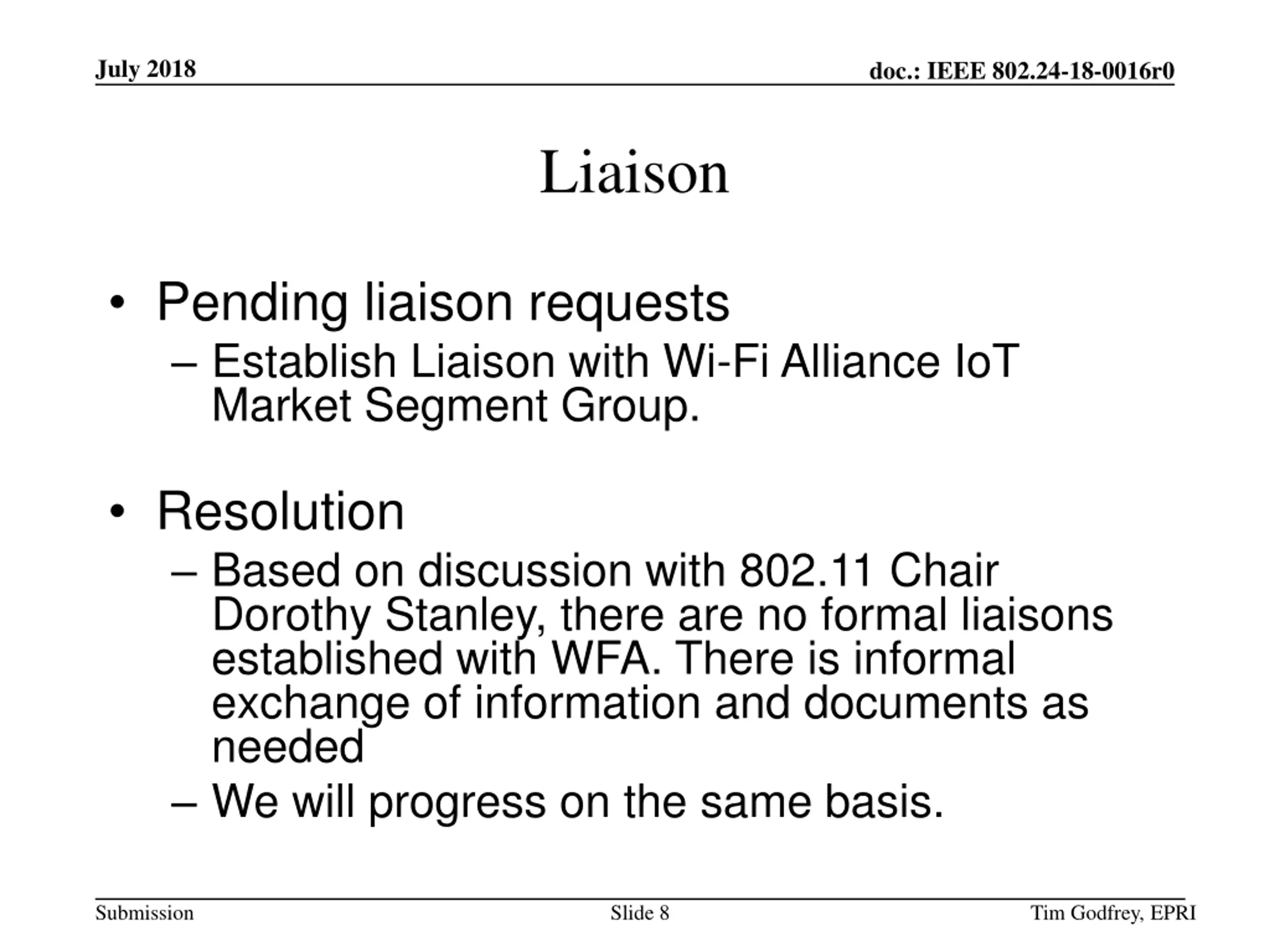 July 2018 doc.: IEEE 802.24-18-0016r0 Liaison Pending liaison requests Establish Liaison with Wi-Fi Alliance IoT Market Segment Group. Resolution Based on discussion with 802.11 Chair Dorothy Stanley, there are no formal liaisons established with WFA. There is informal exchange of information and documents as needed We will progress on the same basis. Submission Slide 8 Tim Godfrey, EPRI