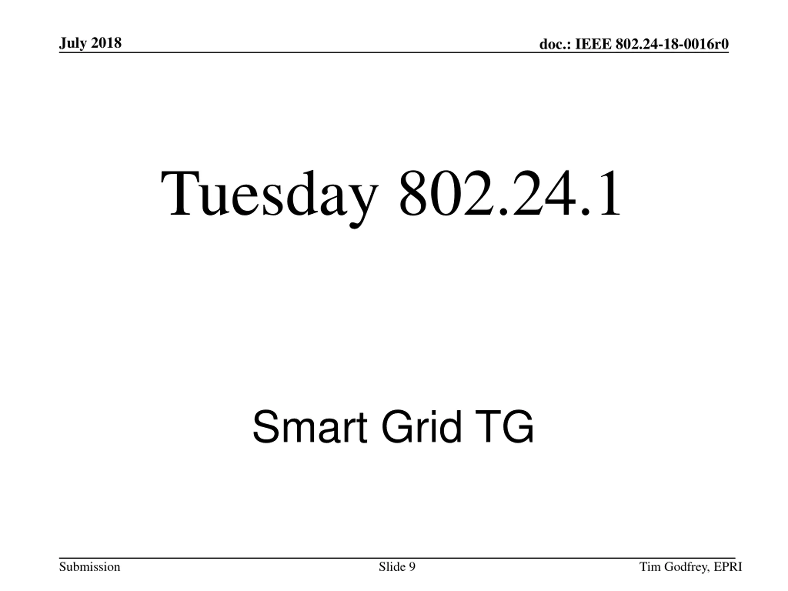 July 2018 doc.: IEEE 802.24-18-0016r0 Tuesday 802.24.1 Smart Grid TG Submission Slide 9 Tim Godfrey, EPRI