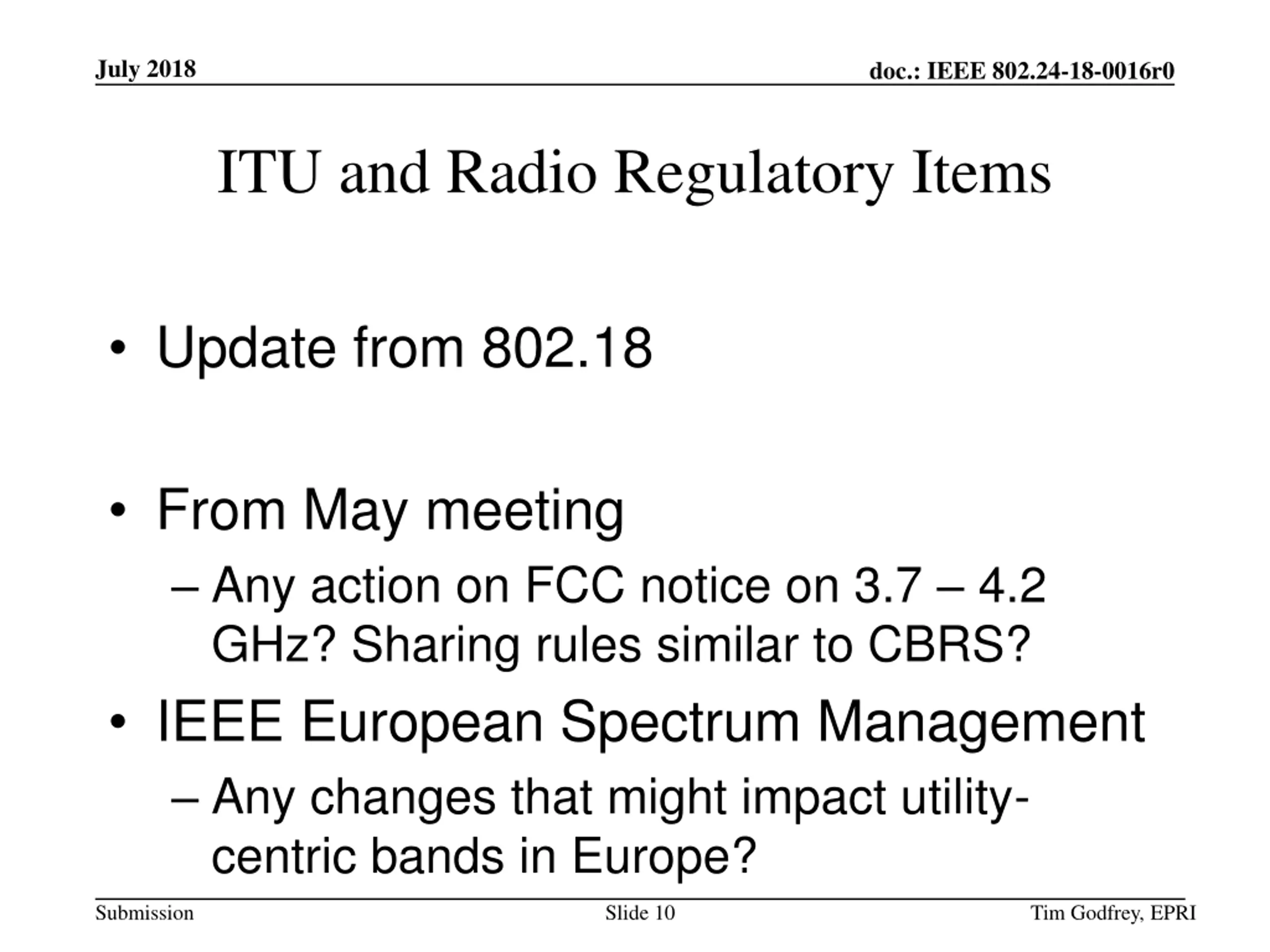 July 2018 doc.: IEEE 802.24-18-0016r0 ITU and Radio Regulatory Items Update from 802.18 From May meeting Any action on FCC notice on 3.7 4.2 GHz? Sharing rules similar to CBRS? IEEE European Spectrum Management Any changes that might impact utility- centric bands in Europe? Submission Slide 10 Tim Godfrey, EPRI