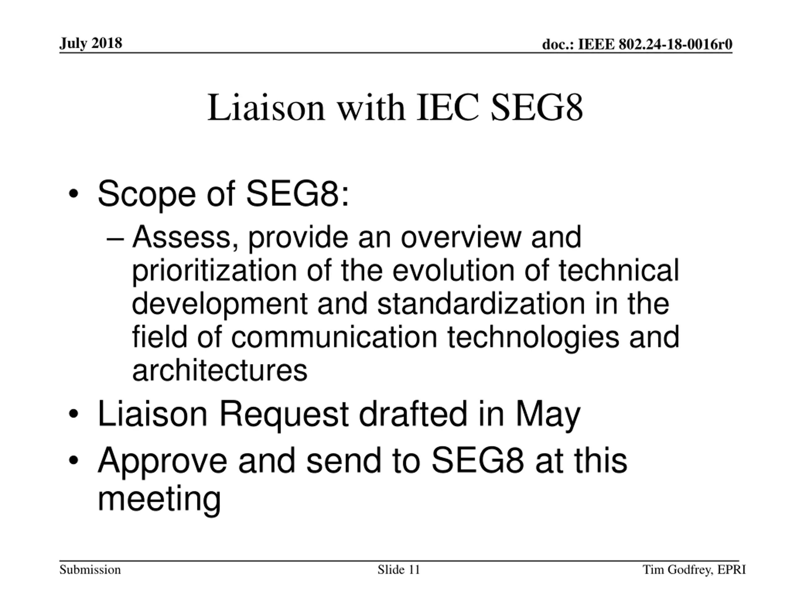 July 2018 doc.: IEEE 802.24-18-0016r0 Liaison with IEC SEG8 Scope of SEG8: Assess, provide an overview and prioritization of the evolution of technical development and standardization in the field of communication technologies and architectures Liaison Request drafted in May Approve and send to SEG8 at this meeting Submission Slide 11 Tim Godfrey, EPRI