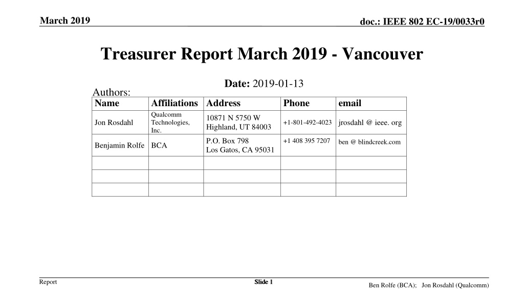 March 2019 doc.: IEEE 802 EC-19/0033r0 Treasurer Report March 2019 - Vancouver Date: 2019-01-13 Authors: Name Affiliations Address Qualcomm Technologies, Inc. Phone email 10871 N 5750 W Highland, UT 84003 +1-801-492-4023 jrosdahl @ ieee. org Jon Rosdahl P.O. Box 798 Los Gatos, CA 95031 +1 408 395 7207 ben @ blindcreek.com Benjamin Rolfe BCA Report Slide 1 Slide 1 Ben Rolfe (BCA); Jon Rosdahl (Qualcomm)