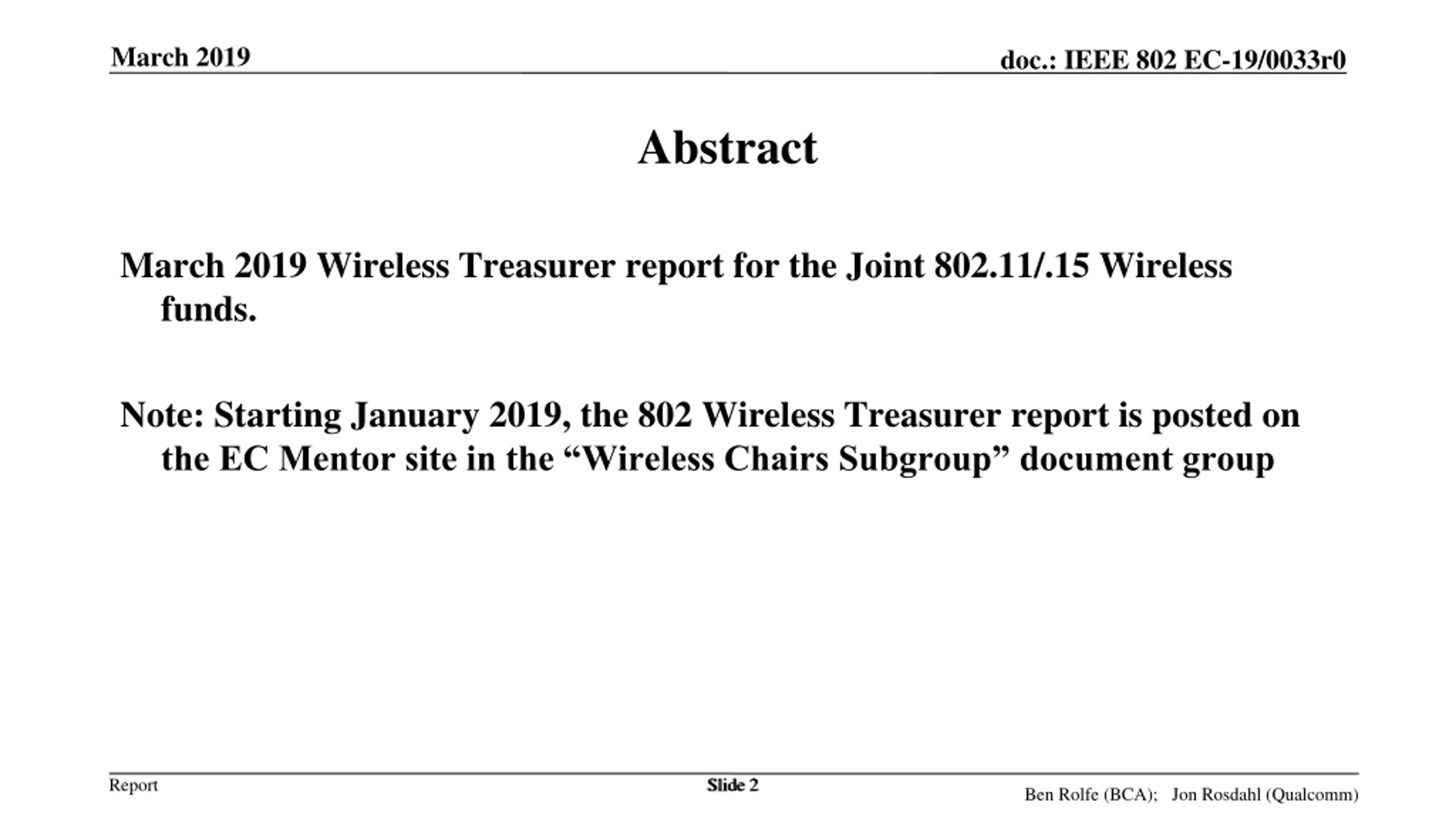 March 2019 doc.: IEEE 802 EC-19/0033r0 Abstract March 2019 Wireless Treasurer report for the Joint 802.11/.15 Wireless funds. Note: Starting January 2019, the 802 Wireless Treasurer report is posted on the EC Mentor site in the Wireless Chairs Subgroup document group Report Slide 2 Slide 2 Ben Rolfe (BCA); Jon Rosdahl (Qualcomm)