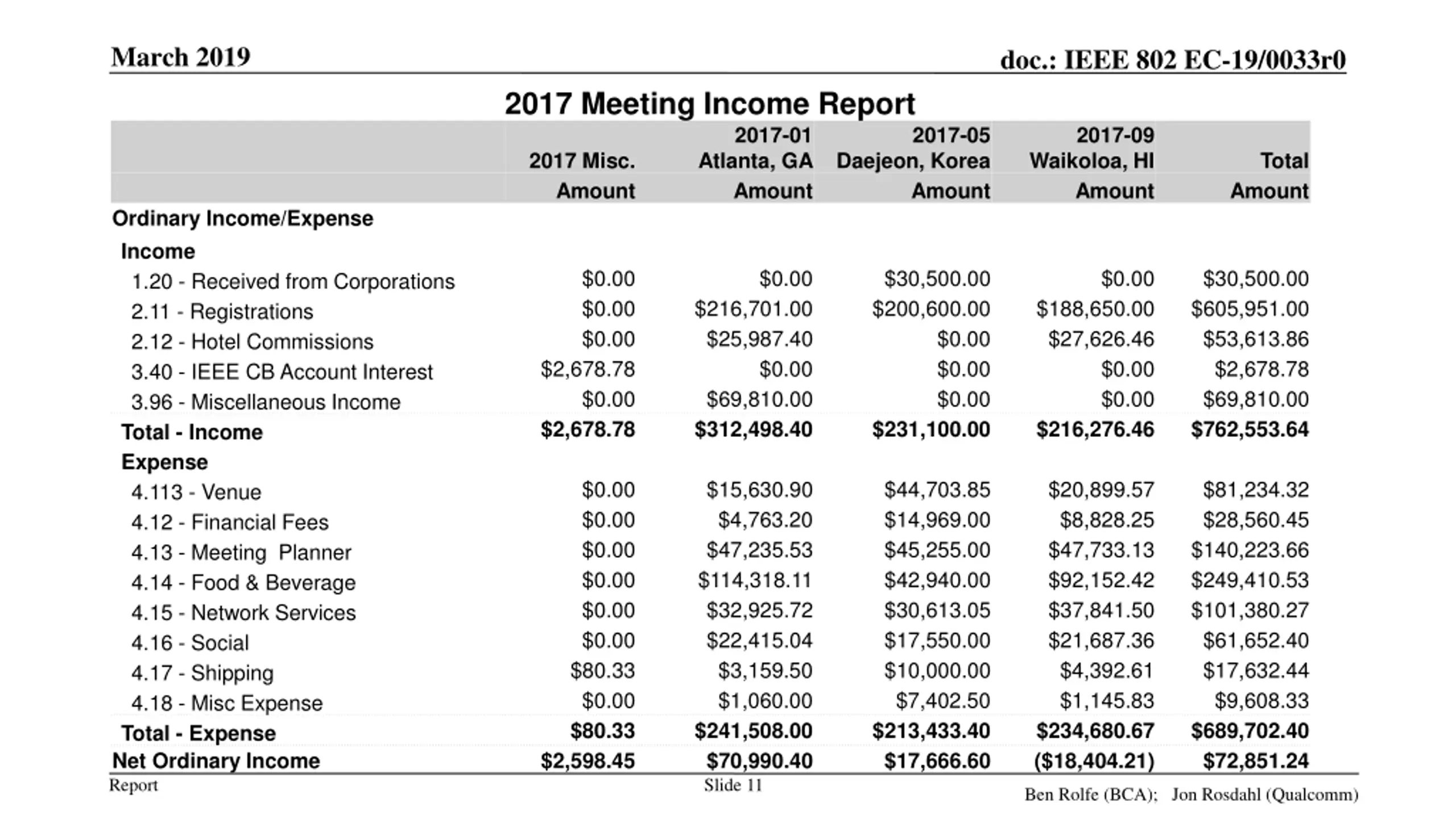 March 2019 doc.: IEEE 802 EC-19/0033r0 2017 Meeting Income Report 2017-01 Atlanta, GA Amount 2017-05 2017-09 2017 Misc. Amount Daejeon, Korea Amount Waikoloa, HI Amount Total Amount Ordinary Income/Expense Income 1.20 - Received from Corporations 2.11 - Registrations 2.12 - Hotel Commissions 3.40 - IEEE CB Account Interest 3.96 - Miscellaneous Income Total - Income Expense 4.113 - Venue 4.12 - Financial Fees 4.13 - Meeting Planner 4.14 - Food & Beverage 4.15 - Network Services 4.16 - Social 4.17 - Shipping 4.18 - Misc Expense Total - Expense Net Ordinary Income $0.00 $0.00 $0.00 $0.00 $30,500.00 $200,600.00 $0.00 $30,500.00 $605,951.00 $53,613.86 $2,678.78 $69,810.00 $762,553.64 $216,701.00 $25,987.40 $188,650.00 $27,626.46 $0.00 $0.00 $0.00 $2,678.78 $0.00 $2,678.78 $0.00 $0.00 $0.00 $69,810.00 $312,498.40 $231,100.00 $216,276.46 $0.00 $0.00 $0.00 $0.00 $0.00 $0.00 $80.33 $0.00 $80.33 $2,598.45 $15,630.90 $4,763.20 $47,235.53 $114,318.11 $32,925.72 $22,415.04 $3,159.50 $1,060.00 $241,508.00 $70,990.40 $44,703.85 $14,969.00 $45,255.00 $42,940.00 $30,613.05 $17,550.00 $10,000.00 $7,402.50 $213,433.40 $17,666.60 $20,899.57 $8,828.25 $47,733.13 $92,152.42 $37,841.50 $21,687.36 $4,392.61 $1,145.83 $234,680.67 ($18,404.21) $81,234.32 $28,560.45 $140,223.66 $249,410.53 $101,380.27 $61,652.40 $17,632.44 $9,608.33 $689,702.40 $72,851.24 Report Slide 11 Ben Rolfe (BCA); Jon Rosdahl (Qualcomm)