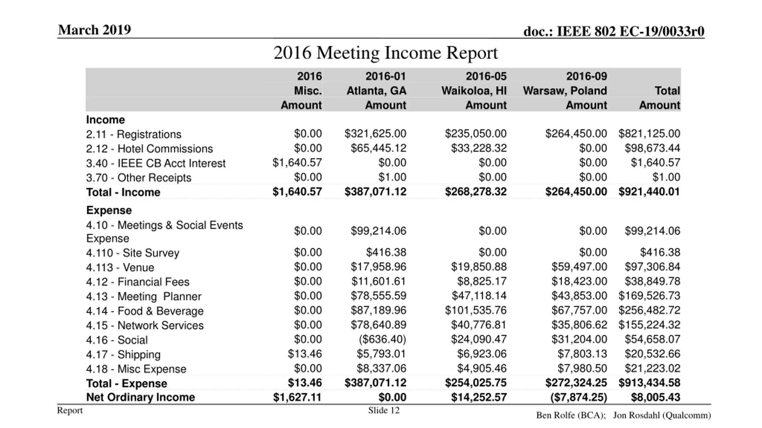 March 2019 doc.: IEEE 802 EC-19/0033r0 2016 Meeting Income Report 2016 Misc. Amount 2016-01 Atlanta, GA Amount 2016-05 2016-09 Waikoloa, HI Amount Warsaw, Poland Total Amount Amount Income 2.11 - Registrations 2.12 - Hotel Commissions 3.40 - IEEE CB Acct Interest 3.70 - Other Receipts Total - Income Expense 4.10 - Meetings & Social Events Expense 4.110 - Site Survey 4.113 - Venue 4.12 - Financial Fees 4.13 - Meeting Planner 4.14 - Food & Beverage 4.15 - Network Services 4.16 - Social 4.17 - Shipping 4.18 - Misc Expense Total - Expense Net Ordinary Income $0.00 $0.00 $321,625.00 $65,445.12 $235,050.00 $33,228.32 $264,450.00 $821,125.00 $0.00 $0.00 $0.00 $264,450.00 $921,440.01 $98,673.44 $1,640.57 $1.00 $1,640.57 $0.00 $1,640.57 $0.00 $1.00 $0.00 $0.00 $387,071.12 $268,278.32 $0.00 $99,214.06 $0.00 $0.00 $99,214.06 $0.00 $0.00 $0.00 $0.00 $0.00 $0.00 $0.00 $13.46 $0.00 $13.46 $1,627.11 $416.38 $17,958.96 $11,601.61 $78,555.59 $87,189.96 $78,640.89 ($636.40) $5,793.01 $8,337.06 $387,071.12 $0.00 $0.00 $416.38 $97,306.84 $38,849.78 $19,850.88 $8,825.17 $47,118.14 $101,535.76 $40,776.81 $24,090.47 $6,923.06 $4,905.46 $254,025.75 $14,252.57 $59,497.00 $18,423.00 $43,853.00 $169,526.73 $67,757.00 $256,482.72 $35,806.62 $155,224.32 $31,204.00 $7,803.13 $7,980.50 $272,324.25 $913,434.58 ($7,874.25) $54,658.07 $20,532.66 $21,223.02 $0.00 $8,005.43 Report Slide 12 Ben Rolfe (BCA); Jon Rosdahl (Qualcomm)