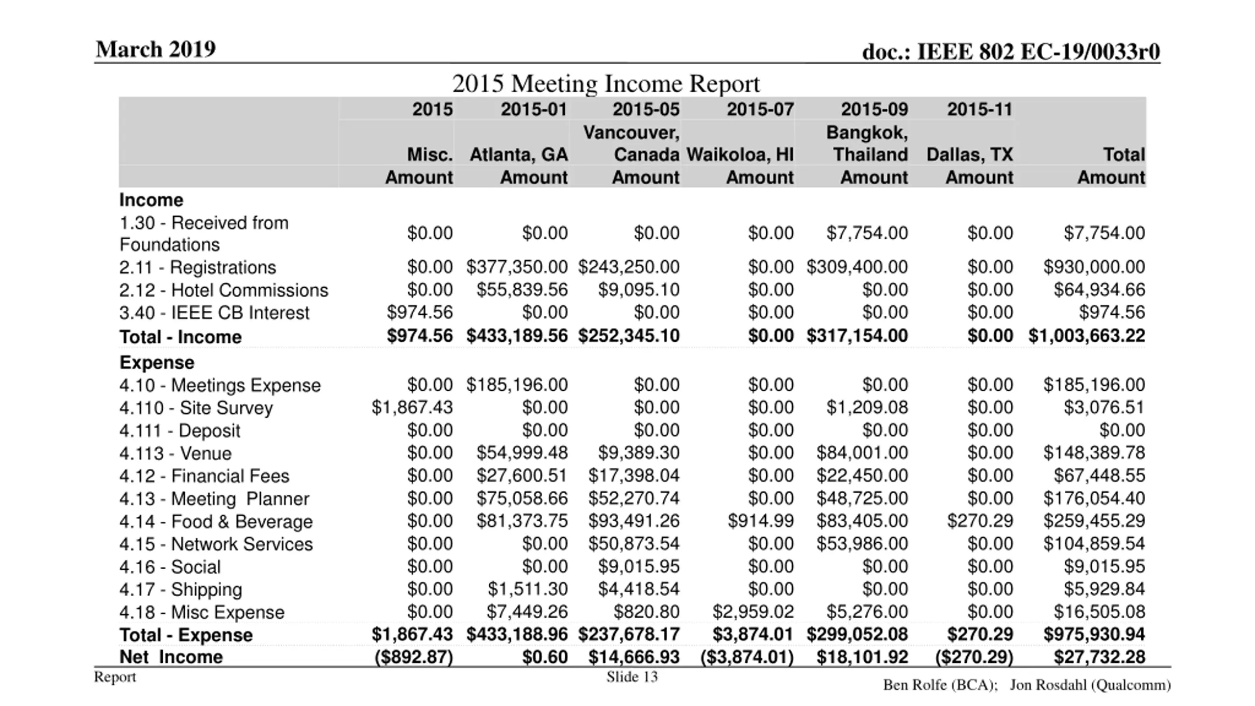 March 2019 doc.: IEEE 802 EC-19/0033r0 2015 Meeting Income Report 2015 2015-01 Vancouver, 2015-05 2015-07 2015-09 Bangkok, Thailand Amount 2015-11 Misc. Atlanta, GA Amount Canada Waikoloa, HI Amount Dallas, TX Amount Total Amount Amount Amount Income 1.30 - Received from Foundations 2.11 - Registrations 2.12 - Hotel Commissions 3.40 - IEEE CB Interest Total - Income Expense 4.10 - Meetings Expense 4.110 - Site Survey 4.111 - Deposit 4.113 - Venue 4.12 - Financial Fees 4.13 - Meeting Planner 4.14 - Food & Beverage 4.15 - Network Services 4.16 - Social 4.17 - Shipping 4.18 - Misc Expense Total - Expense Net Income $0.00 $0.00 $0.00 $0.00 $7,754.00 $0.00 $7,754.00 $0.00 $377,350.00 $243,250.00 $0.00 $55,839.56 $974.56 $0.00 $974.56 $433,189.56 $252,345.10 $0.00 $309,400.00 $0.00 $0.00 $0.00 $317,154.00 $0.00 $0.00 $0.00 $0.00 $1,003,663.22 $930,000.00 $64,934.66 $974.56 $9,095.10 $0.00 $0.00 $0.00 $0.00 $185,196.00 $1,867.43 $0.00 $0.00 $0.00 $0.00 $0.00 $0.00 $0.00 $0.00 $0.00 $1,867.43 $433,188.96 $237,678.17 ($892.87) $0.60 $14,666.93 ($3,874.01) $0.00 $0.00 $0.00 $0.00 $0.00 $0.00 $0.00 $0.00 $0.00 $914.99 $0.00 $0.00 $0.00 $2,959.02 $3,874.01 $299,052.08 $0.00 $0.00 $0.00 $0.00 $0.00 $0.00 $0.00 $270.29 $0.00 $0.00 $0.00 $0.00 $270.29 ($270.29) $185,196.00 $3,076.51 $0.00 $0.00 $1,209.08 $0.00 $84,001.00 $22,450.00 $48,725.00 $83,405.00 $53,986.00 $0.00 $0.00 $5,276.00 $0.00 $54,999.48 $27,600.51 $17,398.04 $75,058.66 $52,270.74 $81,373.75 $93,491.26 $0.00 $50,873.54 $0.00 $1,511.30 $7,449.26 $9,389.30 $148,389.78 $67,448.55 $176,054.40 $259,455.29 $104,859.54 $9,015.95 $5,929.84 $16,505.08 $975,930.94 $27,732.28 $9,015.95 $4,418.54 $820.80 $18,101.92 Report Slide 13 Ben Rolfe (BCA); Jon Rosdahl (Qualcomm)