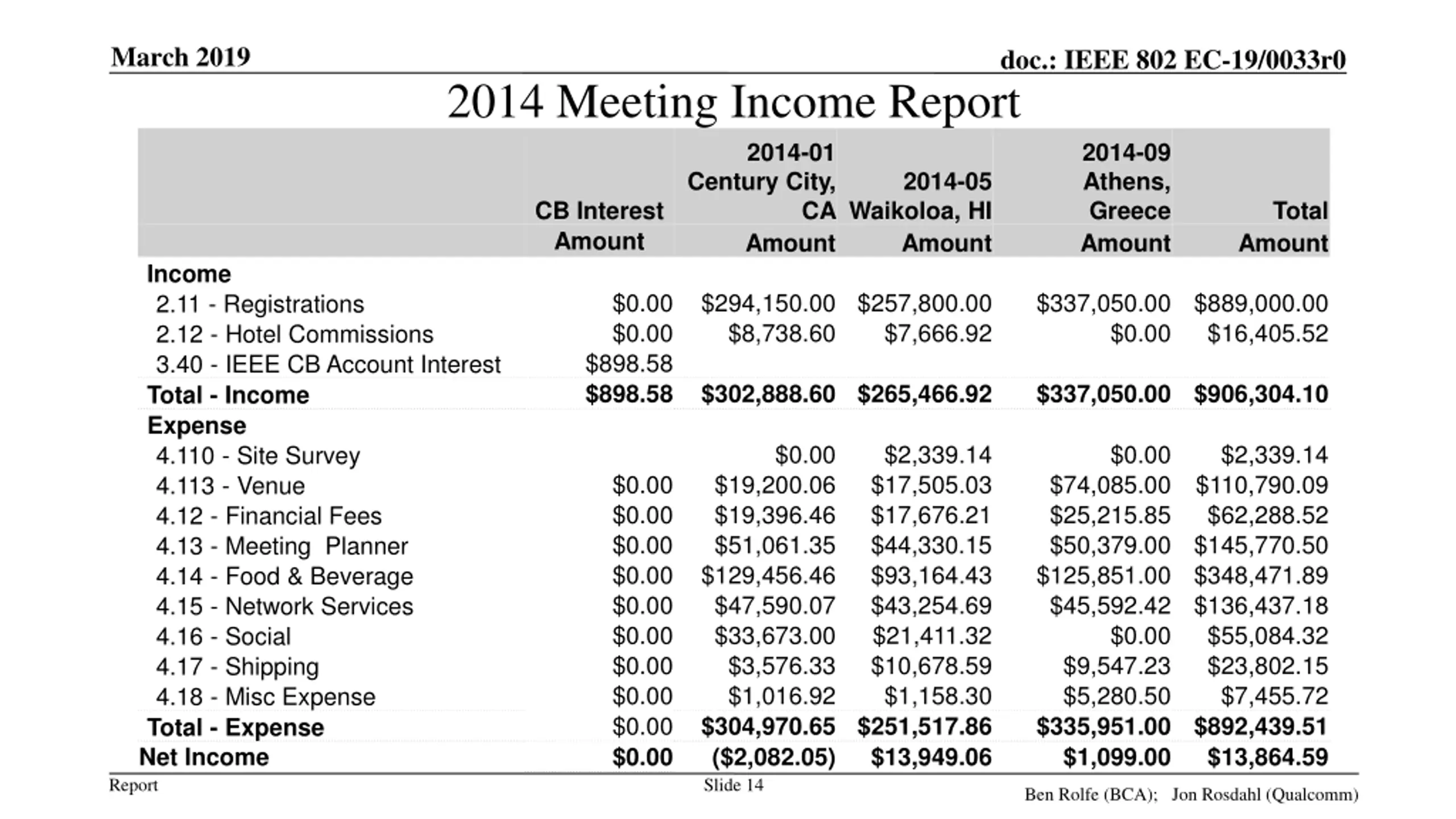 March 2019 doc.: IEEE 802 EC-19/0033r0 2014 Meeting Income Report 2014-01 2014-09 Athens, Greece Amount Century City, 2014-05 CB Interest Amount CA Waikoloa, HI Amount Total Amount Amount Income 2.11 - Registrations 2.12 - Hotel Commissions 3.40 - IEEE CB Account Interest Total - Income Expense 4.110 - Site Survey 4.113 - Venue 4.12 - Financial Fees 4.13 - Meeting Planner 4.14 - Food & Beverage 4.15 - Network Services 4.16 - Social 4.17 - Shipping 4.18 - Misc Expense Total - Expense Net Income $0.00 $294,150.00 $257,800.00 $0.00 $8,738.60 $898.58 $898.58 $302,888.60 $265,466.92 $337,050.00 $889,000.00 $0.00 $7,666.92 $16,405.52 $337,050.00 $906,304.10 $0.00 $2,339.14 $17,505.03 $17,676.21 $44,330.15 $93,164.43 $43,254.69 $21,411.32 $10,678.59 $1,158.30 $0.00 $2,339.14 $0.00 $0.00 $0.00 $0.00 $129,456.46 $0.00 $47,590.07 $0.00 $33,673.00 $0.00 $0.00 $0.00 $304,970.65 $251,517.86 $0.00 ($2,082.05) $19,200.06 $19,396.46 $51,061.35 $74,085.00 $110,790.09 $25,215.85 $50,379.00 $145,770.50 $125,851.00 $348,471.89 $45,592.42 $136,437.18 $0.00 $9,547.23 $5,280.50 $335,951.00 $892,439.51 $1,099.00 $62,288.52 $55,084.32 $23,802.15 $7,455.72 $3,576.33 $1,016.92 $13,949.06 $13,864.59 Report Slide 14 Ben Rolfe (BCA); Jon Rosdahl (Qualcomm)