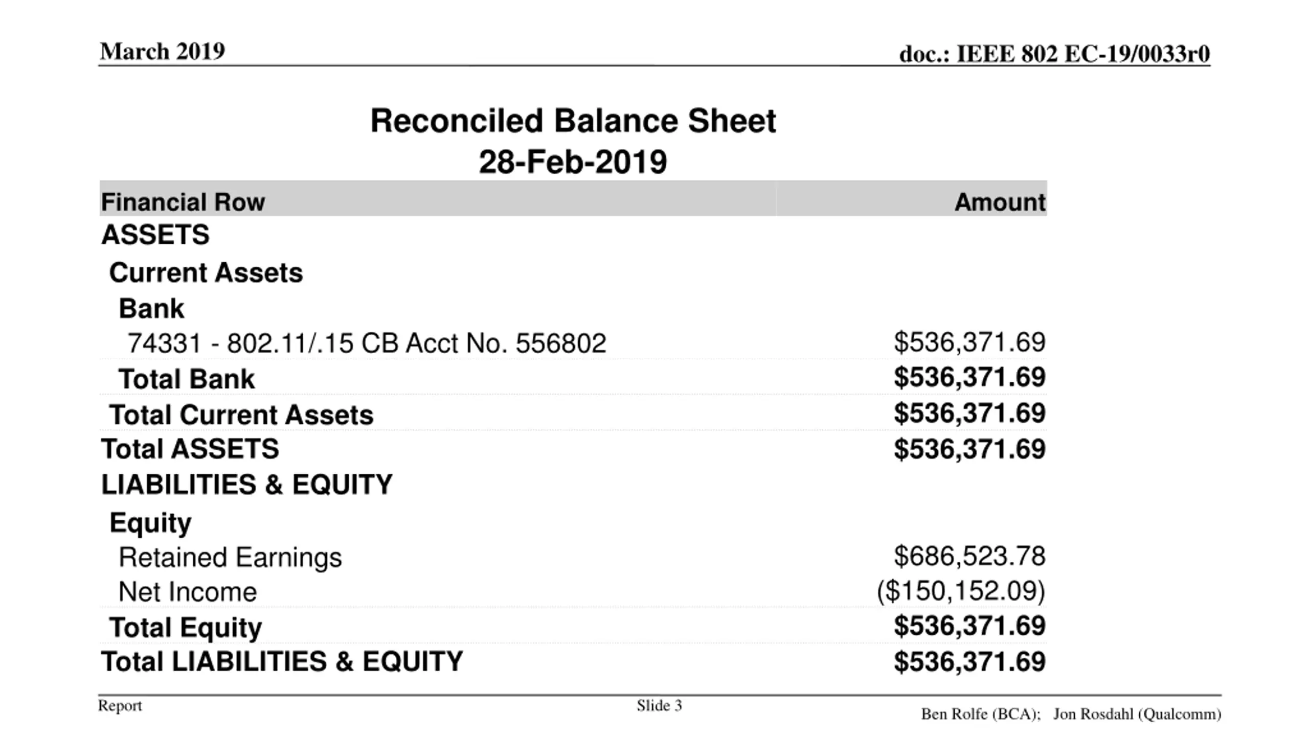March 2019 doc.: IEEE 802 EC-19/0033r0 Reconciled Balance Sheet 28-Feb-2019 Financial Row ASSETS Current Assets Bank 74331 - 802.11/.15 CB Acct No. 556802 Total Bank Total Current Assets Total ASSETS LIABILITIES & EQUITY Equity Retained Earnings Net Income Total Equity Total LIABILITIES & EQUITY Amount $536,371.69 $536,371.69 $536,371.69 $536,371.69 $686,523.78 ($150,152.09) $536,371.69 $536,371.69 Report Slide 3 Ben Rolfe (BCA); Jon Rosdahl (Qualcomm)