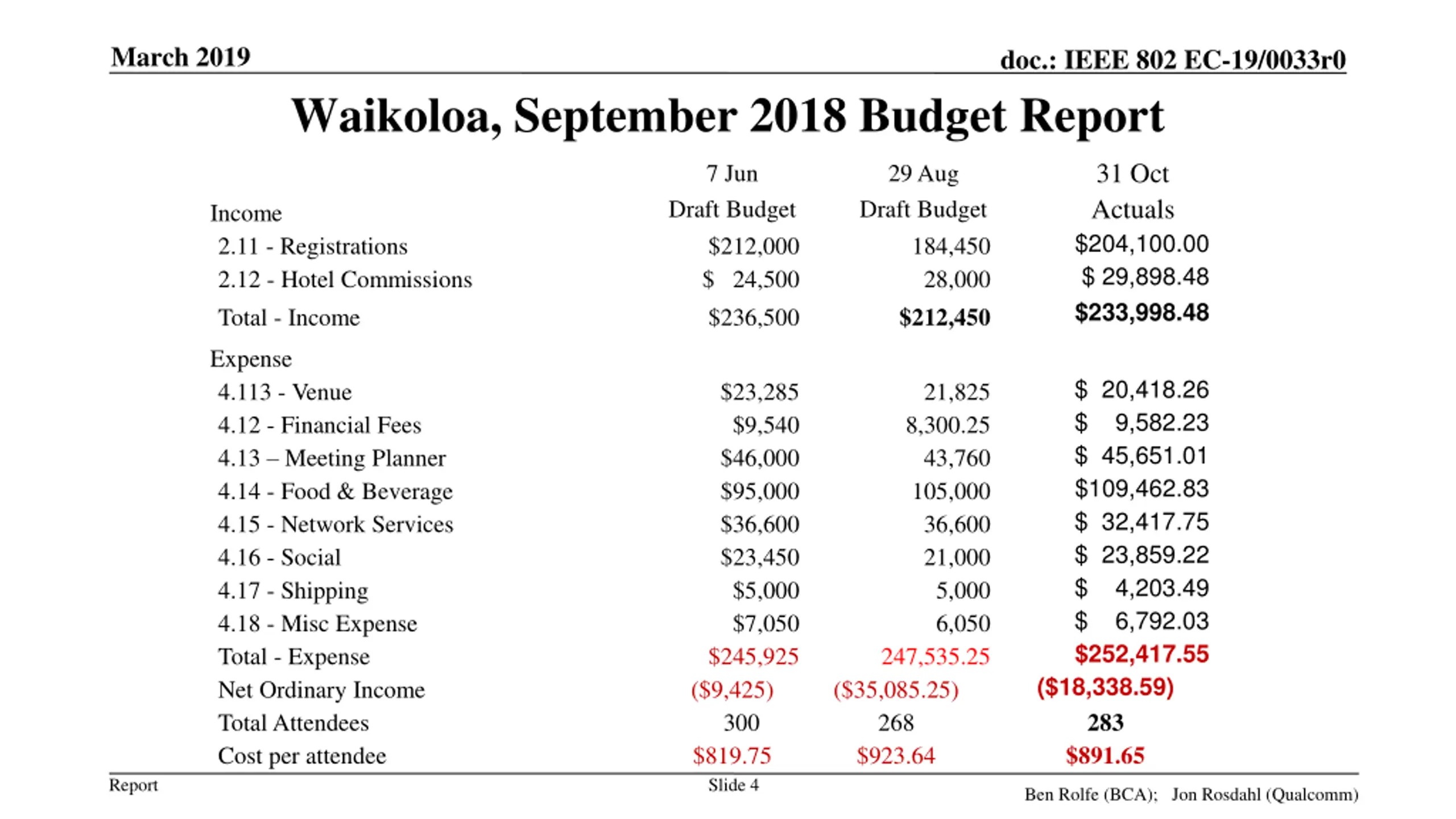 March 2019 doc.: IEEE 802 EC-19/0033r0 Waikoloa, September 2018 Budget Report 31 Oct Actuals $204,100.00 $ 29,898.48 $233,998.48 7 Jun 29 Aug Draft Budget 184,450 28,000 $212,450 Draft Budget $212,000 $ 24,500 $236,500 Income 2.11 - Registrations 2.12 - Hotel Commissions Total - Income Expense 4.113 - Venue 4.12 - Financial Fees 4.13 Meeting Planner 4.14 - Food & Beverage 4.15 - Network Services 4.16 - Social 4.17 - Shipping 4.18 - Misc Expense Total - Expense Net Ordinary Income Total Attendees Cost per attendee $ 20,418.26 $ 9,582.23 $ 45,651.01 $109,462.83 $ 32,417.75 $ 23,859.22 $ 4,203.49 $ 6,792.03 $252,417.55 ($18,338.59) 283 $891.65 $23,285 $9,540 $46,000 $95,000 $36,600 $23,450 $5,000 $7,050 $245,925 ($9,425) 300 $819.75 Slide 4 21,825 8,300.25 43,760 105,000 36,600 21,000 5,000 6,050 247,535.25 ($35,085.25) 268 $923.64 Report Ben Rolfe (BCA); Jon Rosdahl (Qualcomm)