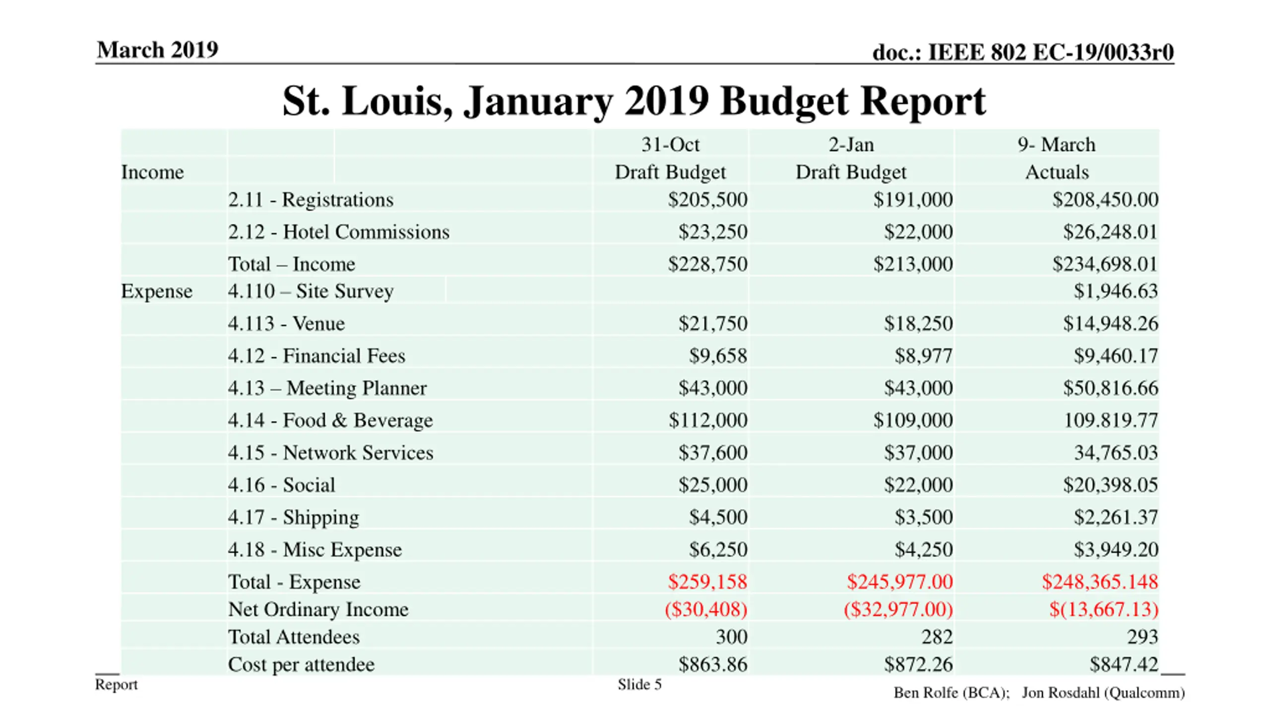 March 2019 doc.: IEEE 802 EC-19/0033r0 St. Louis, January 2019 Budget Report 31-Oct Draft Budget $205,500 $23,250 $228,750 2-Jan 9- March Actuals $208,450.00 $26,248.01 $234,698.01 $1,946.63 $14,948.26 $9,460.17 $50,816.66 109.819.77 34,765.03 $20,398.05 $2,261.37 $3,949.20 $248,365.148 $(13,667.13) Income Draft Budget 2.11 - Registrations 2.12 - Hotel Commissions Total Income 4.110 Site Survey 4.113 - Venue 4.12 - Financial Fees 4.13 Meeting Planner 4.14 - Food & Beverage 4.15 - Network Services 4.16 - Social 4.17 - Shipping 4.18 - Misc Expense Total - Expense Net Ordinary Income Total Attendees Cost per attendee $191,000 $22,000 $213,000 Expense $21,750 $9,658 $43,000 $112,000 $37,600 $25,000 $4,500 $6,250 $259,158 ($30,408) $18,250 $8,977 $43,000 $109,000 $37,000 $22,000 $3,500 $4,250 $245,977.00 ($32,977.00) 300 282 293 $863.86 $872.26 $847.42 Report Slide 5 Ben Rolfe (BCA); Jon Rosdahl (Qualcomm)