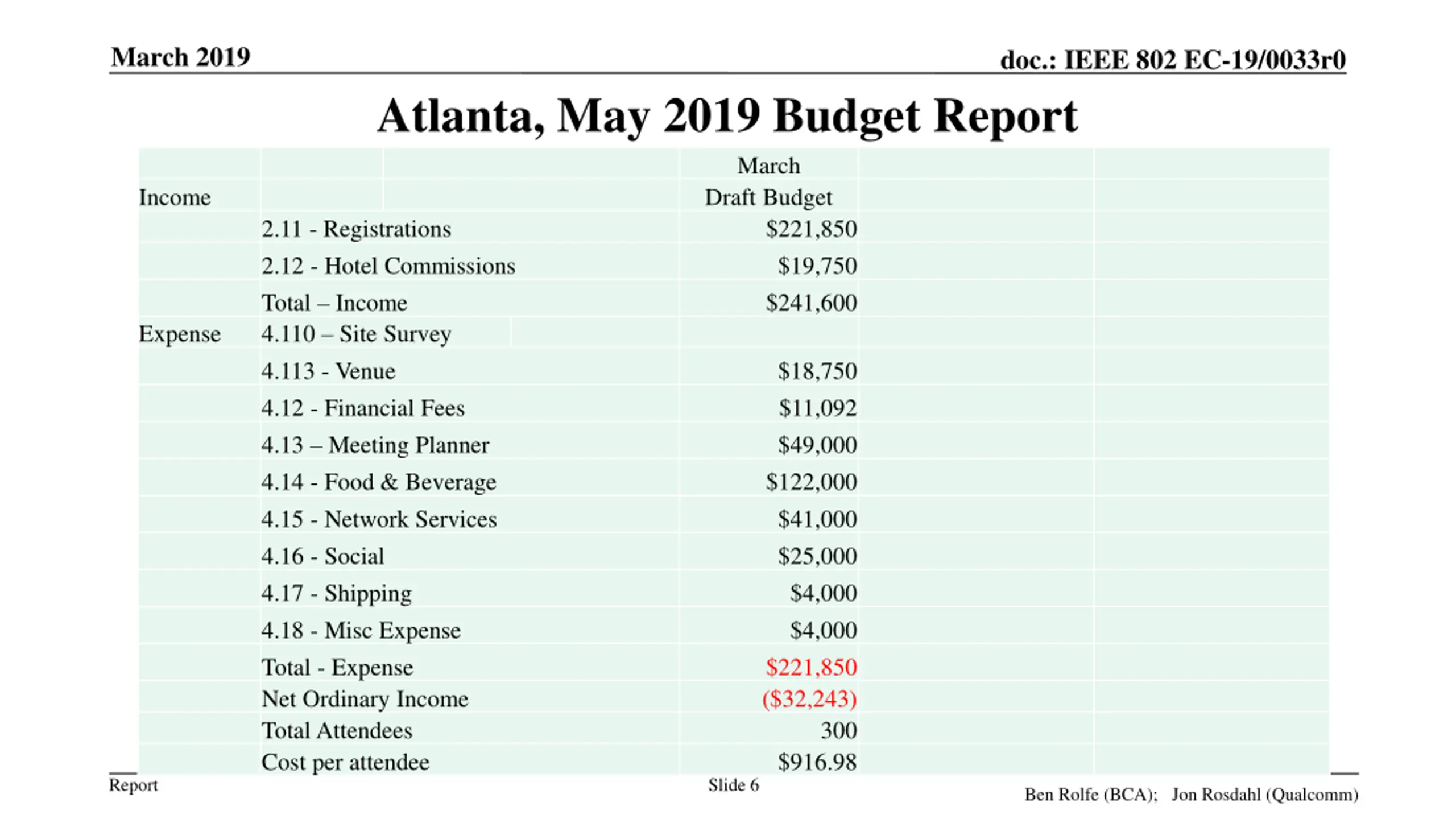 March 2019 doc.: IEEE 802 EC-19/0033r0 Atlanta, May 2019 Budget Report March Income Draft Budget $221,850 $19,750 $241,600 2.11 - Registrations 2.12 - Hotel Commissions Total Income 4.110 Site Survey 4.113 - Venue 4.12 - Financial Fees 4.13 Meeting Planner 4.14 - Food & Beverage 4.15 - Network Services 4.16 - Social 4.17 - Shipping 4.18 - Misc Expense Total - Expense Net Ordinary Income Total Attendees Cost per attendee Expense $18,750 $11,092 $49,000 $122,000 $41,000 $25,000 $4,000 $4,000 $221,850 ($32,243) 300 $916.98 Report Slide 6 Ben Rolfe (BCA); Jon Rosdahl (Qualcomm)