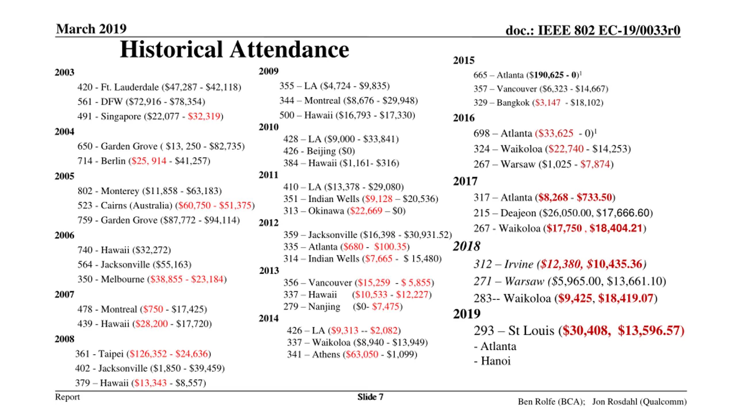 March 2019 doc.: IEEE 802 EC-19/0033r0 Historical Attendance 2015 2009 2003 665 Atlanta ($190,625 - 0)1 357 Vancouver ($6,323 - $14,667) 329 Bangkok ($3,147 - $18,102) 2016 698 Atlanta ($33,625 - 0)1 324 Waikoloa ($22,740 - $14,253) 267 Warsaw ($1,025 - $7,874) 2017 317 Atlanta ($8,268 - $733.50) 215 Deajeon ($26,050.00, $17,666.60) 267 - Waikoloa ($17,750 , $18,404.21) 2018 312 Irvine ($12,380, $10,435.36) 271 Warsaw ($5,965.00, $13,661.10) 283-- Waikoloa ($9,425, $18,419.07) 2019 293 St Louis ($30,408, $13,596.57) - Atlanta - Hanoi 355 LA ($4,724 - $9,835) 344 Montreal ($8,676 - $29,948) 500 Hawaii ($16,793 - $17,330) 420 - Ft. Lauderdale ($47,287 - $42,118) 561 - DFW ($72,916 - $78,354) 491 - Singapore ($22,077 - $32,319) 2010 2004 428 LA ($9,000 - $33,841) 426 - Beijing ($0) 384 Hawaii ($1,161- $316) 650 - Garden Grove ( $13, 250 - $82,735) 714 - Berlin ($25, 914 - $41,257) 2011 2005 410 LA ($13,378 - $29,080) 351 Indian Wells ($9,128 $20,536) 313 Okinawa ($22,669 $0) 802 - Monterey ($11,858 - $63,183) 523 - Cairns (Australia) ($60,750 - $51,375) 759 - Garden Grove ($87,772 - $94,114) 2012 359 Jacksonville ($16,398 - $30,931.52) 335 Atlanta ($680 - $100.35) 314 Indian Wells ($7,665 - $ 15,480) 2006 740 - Hawaii ($32,272) 564 - Jacksonville ($55,163) 350 - Melbourne ($38,855 - $23,184) 2013 356 Vancouver ($15,259 - $ 5,855) 337 Hawaii ($10,533 - $12,227) 279 Nanjing ($0- $7,475) 2007 478 - Montreal ($750 - $17,425) 439 - Hawaii ($28,200 - $17,720) 2014 426 LA ($9,313 -- $2,082) 337 Waikoloa ($8,940 - $13,949) 341 Athens ($63,050 - $1,099) 2008 361 - Taipei ($126,352 - $24,636) 402 - Jacksonville ($1,850 - $39,459) 379 Hawaii ($13,343 - $8,557) Report Slide 7 Slide 7 Ben Rolfe (BCA); Jon Rosdahl (Qualcomm)
