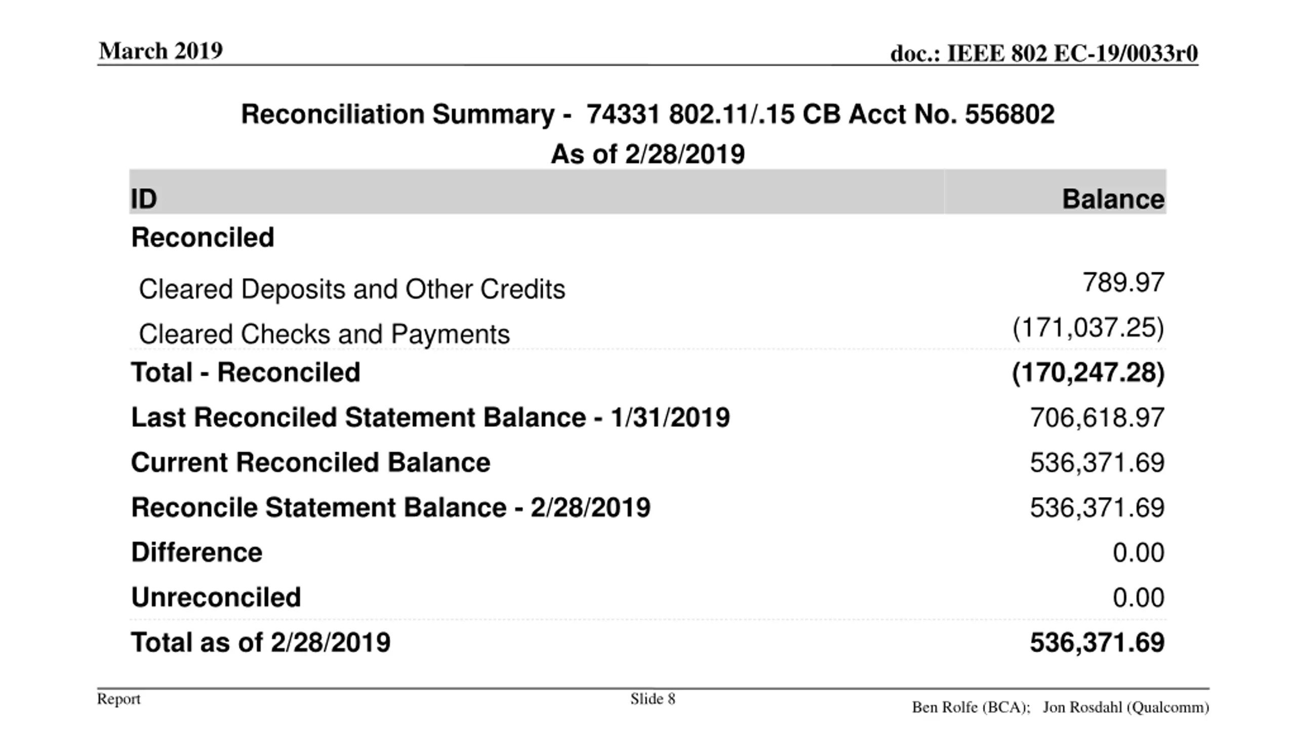 March 2019 doc.: IEEE 802 EC-19/0033r0 Reconciliation Summary - 74331 802.11/.15 CB Acct No. 556802 As of 2/28/2019 ID Reconciled Balance 789.97 Cleared Deposits and Other Credits Cleared Checks and Payments Total - Reconciled Last Reconciled Statement Balance - 1/31/2019 Current Reconciled Balance Reconcile Statement Balance - 2/28/2019 Difference Unreconciled Total as of 2/28/2019 (171,037.25) (170,247.28) 706,618.97 536,371.69 536,371.69 0.00 0.00 536,371.69 Report Slide 8 Ben Rolfe (BCA); Jon Rosdahl (Qualcomm)