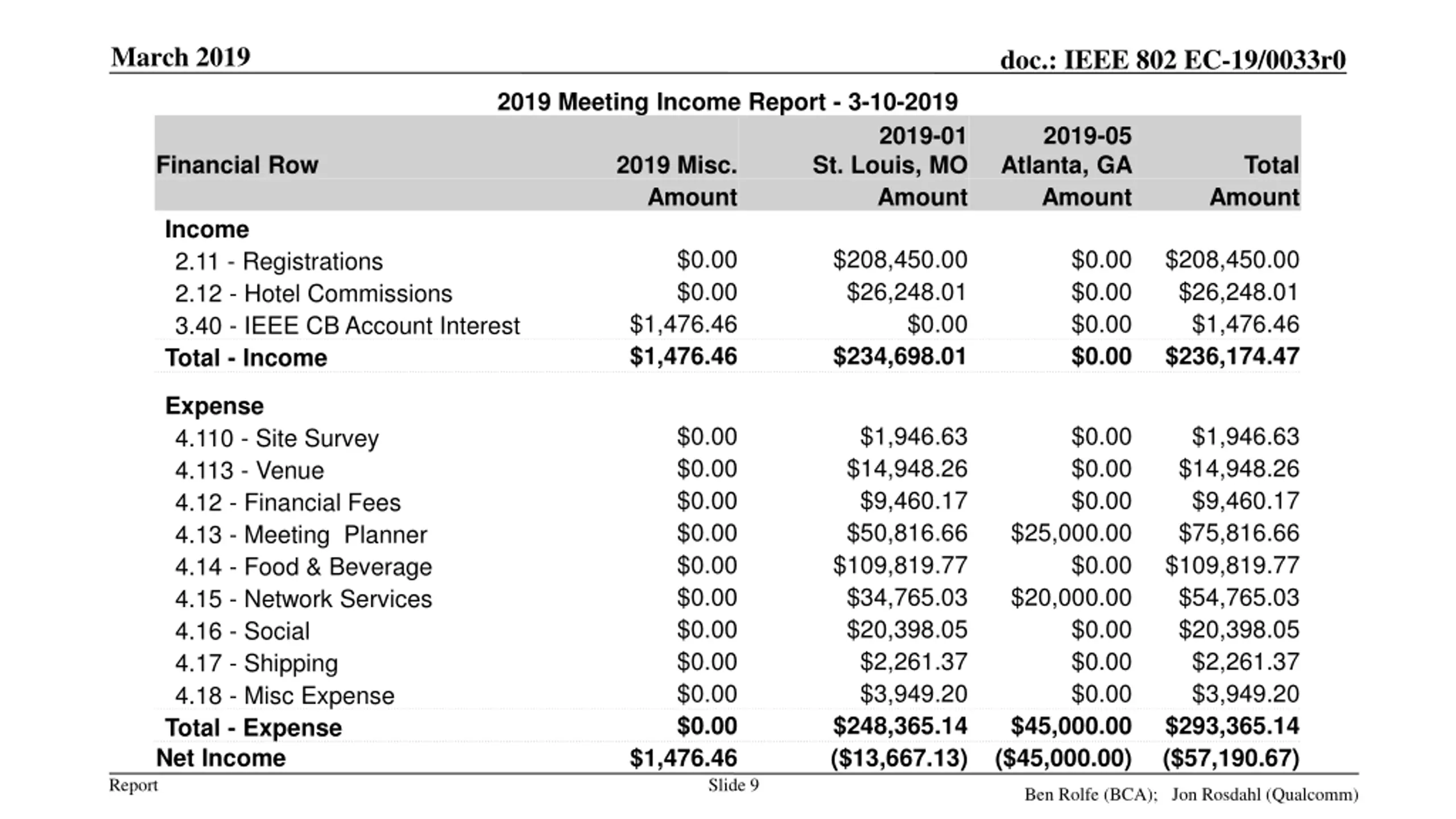 March 2019 doc.: IEEE 802 EC-19/0033r0 2019 Meeting Income Report - 3-10-2019 2019-01 2019-05 Atlanta, GA Amount Financial Row 2019 Misc. Amount St. Louis, MO Amount Total Amount Income 2.11 - Registrations 2.12 - Hotel Commissions 3.40 - IEEE CB Account Interest Total - Income $0.00 $0.00 $208,450.00 $26,248.01 $0.00 $0.00 $0.00 $0.00 $208,450.00 $26,248.01 $1,476.46 $236,174.47 $1,476.46 $1,476.46 $0.00 $234,698.01 Expense 4.110 - Site Survey 4.113 - Venue 4.12 - Financial Fees 4.13 - Meeting Planner 4.14 - Food & Beverage 4.15 - Network Services 4.16 - Social 4.17 - Shipping 4.18 - Misc Expense Total - Expense Net Income $0.00 $0.00 $0.00 $0.00 $0.00 $0.00 $0.00 $0.00 $0.00 $0.00 $1,946.63 $14,948.26 $9,460.17 $50,816.66 $109,819.77 $34,765.03 $20,398.05 $2,261.37 $3,949.20 $248,365.14 ($13,667.13) $0.00 $0.00 $0.00 $1,946.63 $14,948.26 $9,460.17 $75,816.66 $109,819.77 $54,765.03 $20,398.05 $2,261.37 $3,949.20 $293,365.14 ($57,190.67) $25,000.00 $0.00 $20,000.00 $0.00 $0.00 $0.00 $45,000.00 ($45,000.00) $1,476.46 Report Slide 9 Ben Rolfe (BCA); Jon Rosdahl (Qualcomm)