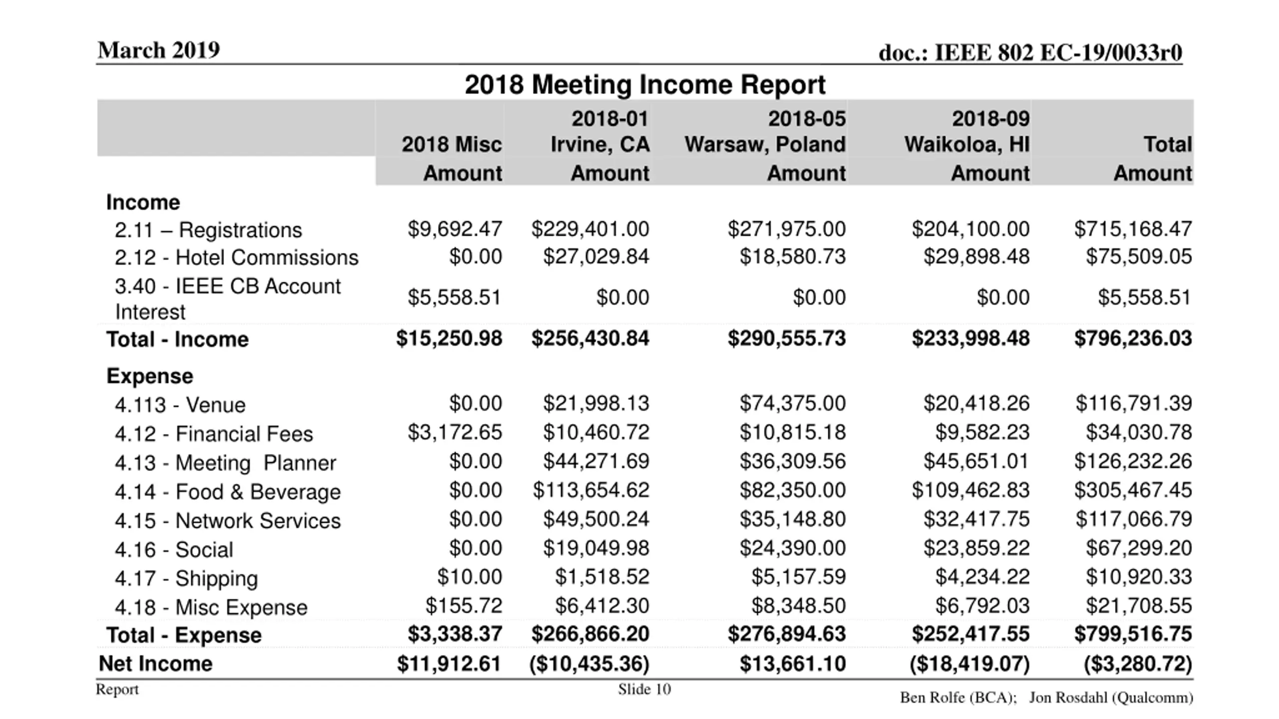 March 2019 doc.: IEEE 802 EC-19/0033r0 2018 Meeting Income Report 2018-01 Irvine, CA Amount Amount 2018-05 2018-09 2018 Misc Warsaw, Poland Waikoloa, HI Amount Total Amount Amount Income 2.11 Registrations 2.12 - Hotel Commissions 3.40 - IEEE CB Account Interest Total - Income $9,692.47 $0.00 $229,401.00 $27,029.84 $271,975.00 $18,580.73 $204,100.00 $29,898.48 $715,168.47 $75,509.05 $5,558.51 $0.00 $0.00 $0.00 $5,558.51 $15,250.98 $256,430.84 $290,555.73 $233,998.48 $796,236.03 Expense 4.113 - Venue 4.12 - Financial Fees 4.13 - Meeting Planner 4.14 - Food & Beverage 4.15 - Network Services 4.16 - Social 4.17 - Shipping 4.18 - Misc Expense Total - Expense Net Income $0.00 $21,998.13 $10,460.72 $44,271.69 $113,654.62 $49,500.24 $19,049.98 $1,518.52 $6,412.30 $266,866.20 ($10,435.36) $74,375.00 $10,815.18 $36,309.56 $82,350.00 $35,148.80 $24,390.00 $5,157.59 $8,348.50 $276,894.63 $13,661.10 $20,418.26 $9,582.23 $45,651.01 $109,462.83 $32,417.75 $23,859.22 $4,234.22 $6,792.03 $252,417.55 ($18,419.07) $116,791.39 $34,030.78 $126,232.26 $305,467.45 $117,066.79 $67,299.20 $10,920.33 $21,708.55 $799,516.75 ($3,280.72) $3,172.65 $0.00 $0.00 $0.00 $0.00 $10.00 $155.72 $3,338.37 $11,912.61 Report Slide 10 Ben Rolfe (BCA); Jon Rosdahl (Qualcomm)