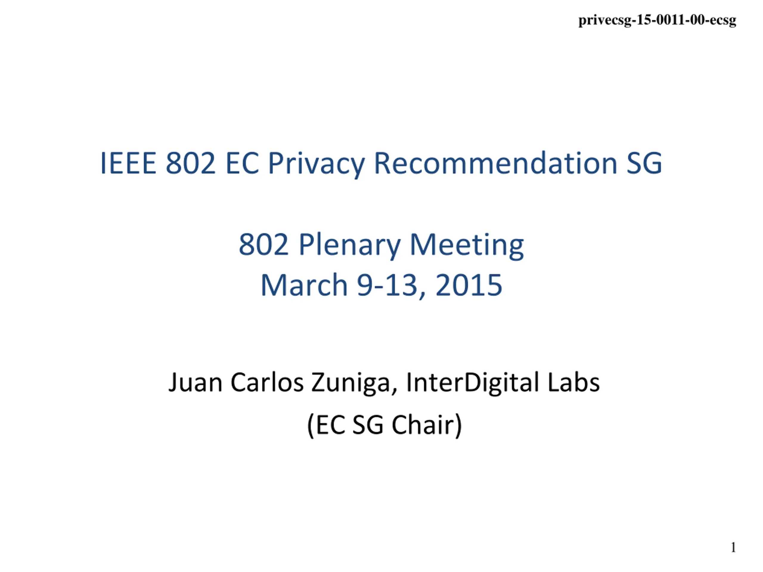 privecsg-15-0011-00-ecsg IEEE 802 EC Privacy Recommendation SG 802 Plenary Meeting March 9-13, 2015 Juan Carlos Zuniga, InterDigital Labs (EC SG Chair) 1