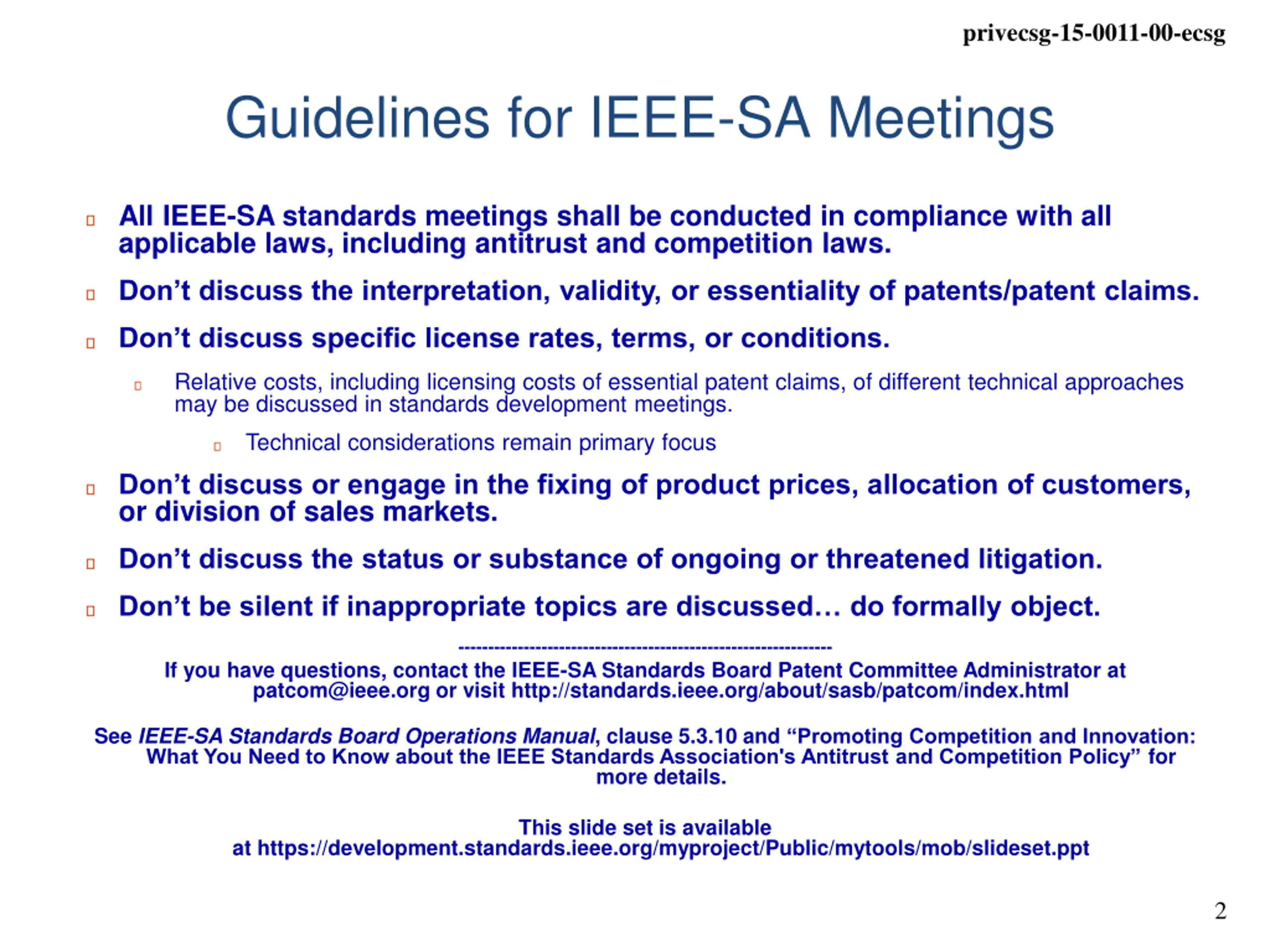 privecsg-15-0011-00-ecsg Guidelines for IEEE-SA Meetings All IEEE-SA standards meetings shall be conducted in compliance with all applicable laws, including antitrust and competition laws. Don t discuss the interpretation, validity, or essentiality of patents/patent claims. Don t discuss specific license rates, terms, or conditions. Relative costs, including licensing costs of essential patent claims, of different technical approaches may be discussed in standards development meetings. Technical considerations remain primary focus Don t discuss or engage in the fixing of product prices, allocation of customers, or division of sales markets. Don t discuss the status or substance of ongoing or threatened litigation. Don t be silent if inappropriate topics are discussed do formally object. --------------------------------------------------------------- If you have questions, contact the IEEE-SA Standards Board Patent Committee Administrator at patcom@ieee.org or visit http://standards.ieee.org/about/sasb/patcom/index.html See IEEE-SA Standards Board Operations Manual, clause 5.3.10 and Promoting Competition and Innovation: What You Need to Know about the IEEE Standards Association's Antitrust and Competition Policy for more details. This slide set is available at https://development.standards.ieee.org/myproject/Public/mytools/mob/slideset.ppt 2