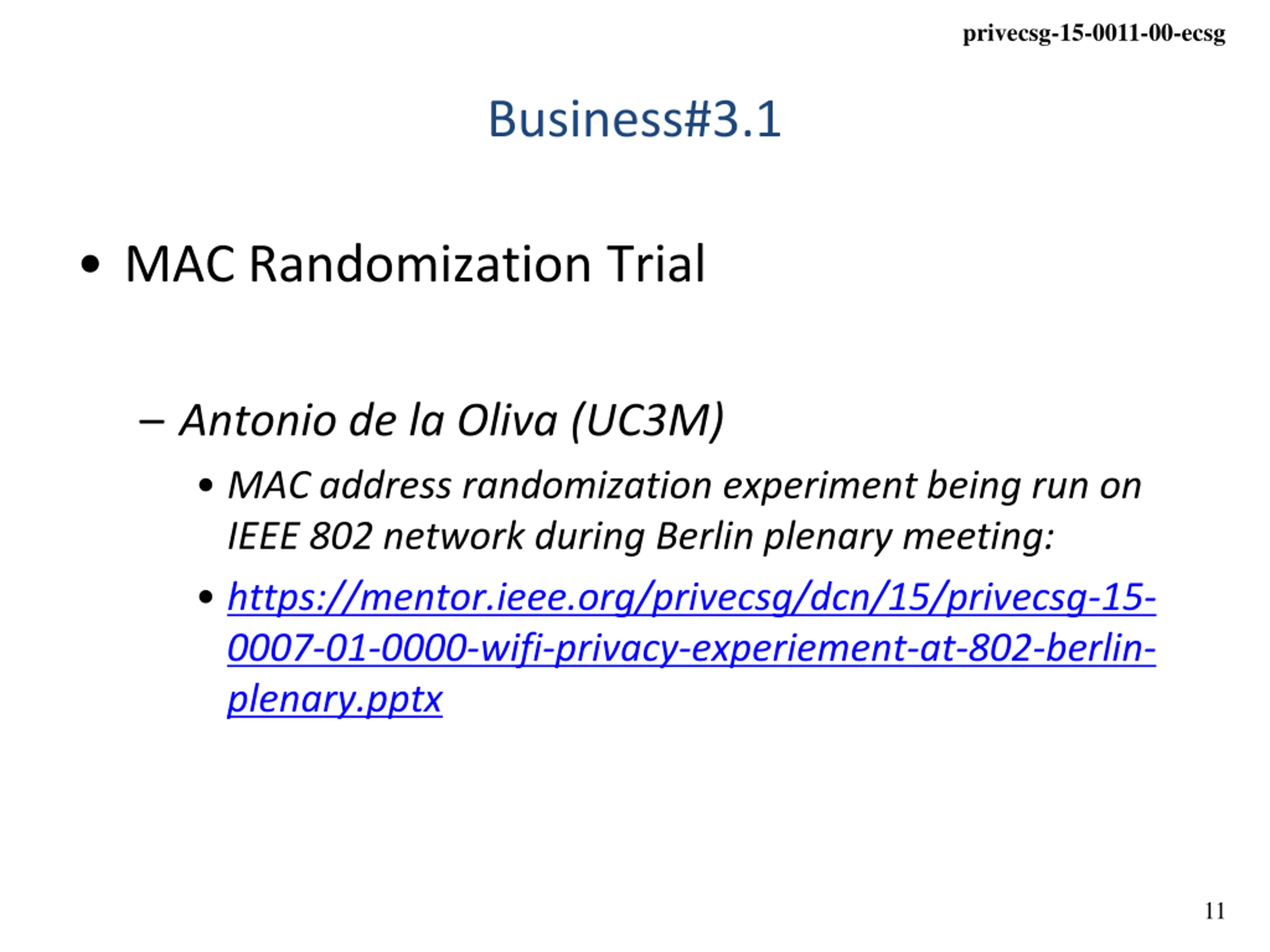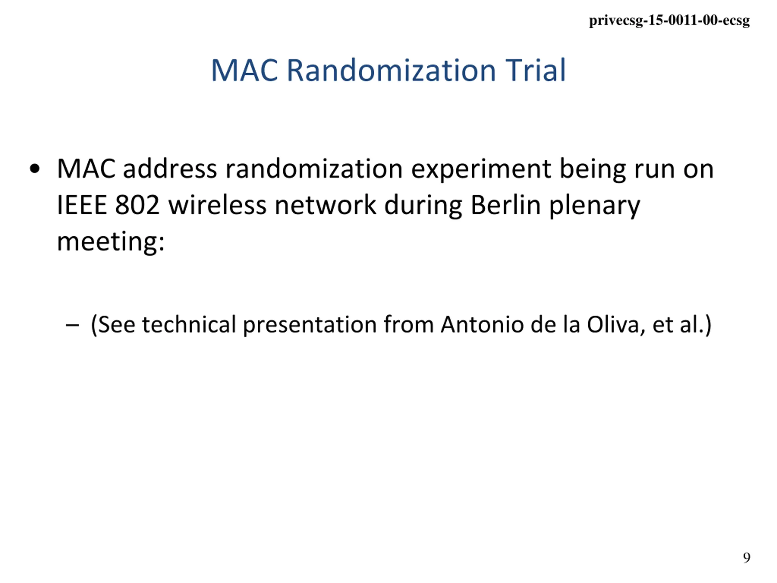 privecsg-15-0011-00-ecsg MAC Randomization Trial MAC address randomization experiment being run on IEEE 802 wireless network during Berlin plenary meeting: (See technical presentation from Antonio de la Oliva, et al.) 9