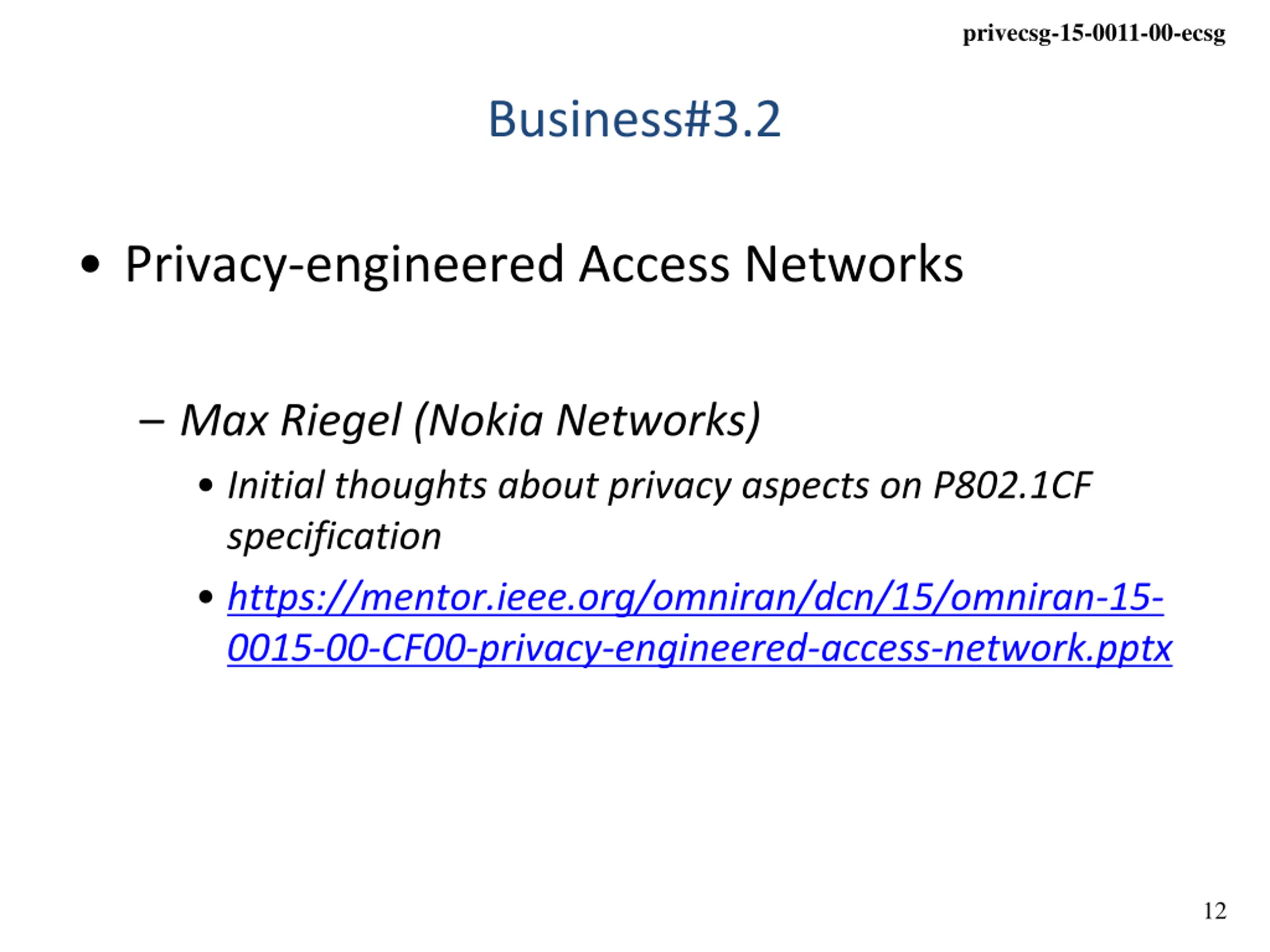 privecsg-15-0011-00-ecsg Business#3.2 Privacy-engineered Access Networks Max Riegel (Nokia Networks) Initial thoughts about privacy aspects on P802.1CF specification https://mentor.ieee.org/omniran/dcn/15/omniran-15- 0015-00-CF00-privacy-engineered-access-network.pptx 12