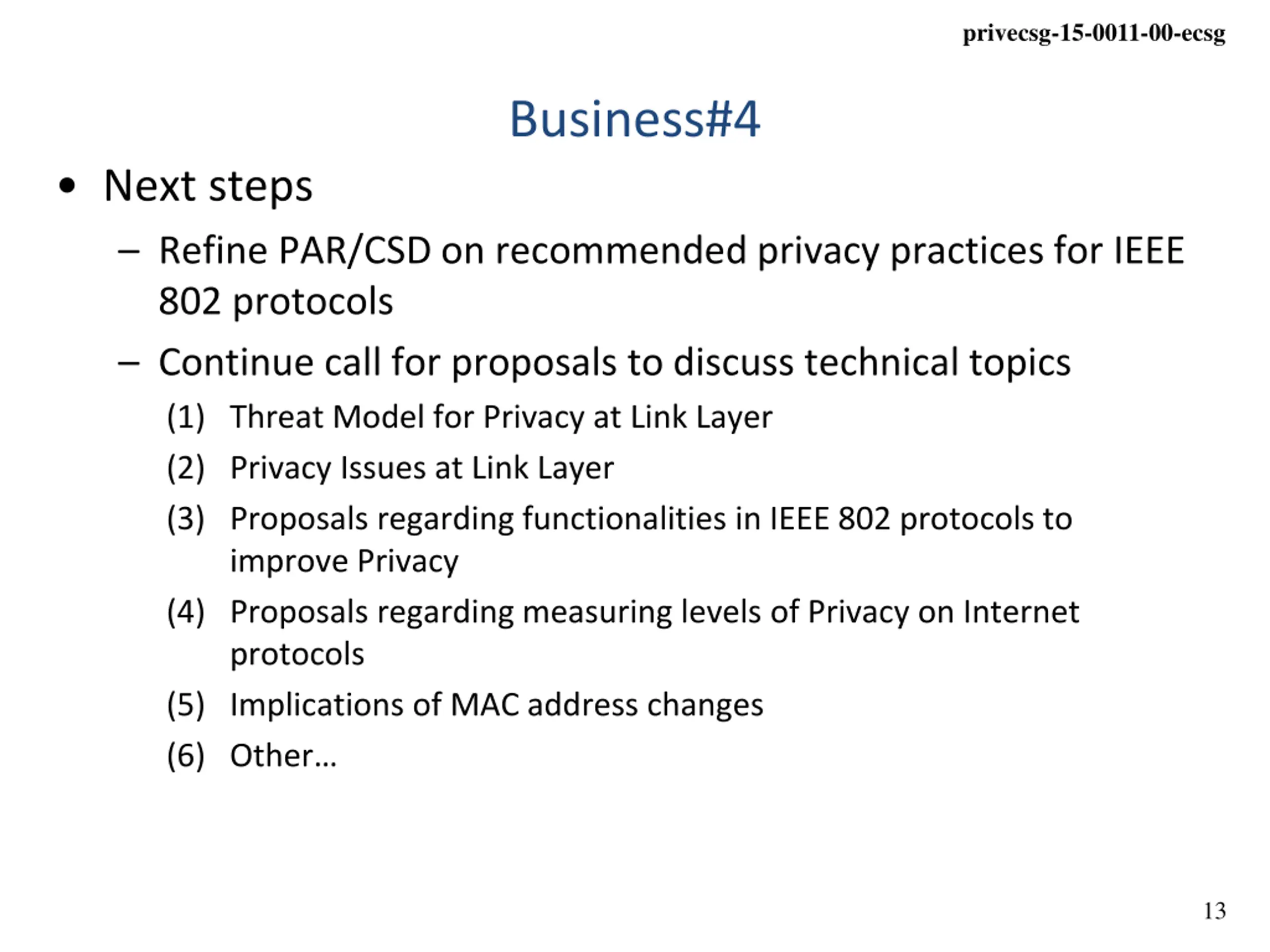 privecsg-15-0011-00-ecsg Business#4 Next steps Refine PAR/CSD on recommended privacy practices for IEEE 802 protocols Continue call for proposals to discuss technical topics (1) Threat Model for Privacy at Link Layer (2) Privacy Issues at Link Layer (3) Proposals regarding functionalities in IEEE 802 protocols to improve Privacy (4) Proposals regarding measuring levels of Privacy on Internet protocols (5) Implications of MAC address changes (6) Other 13
