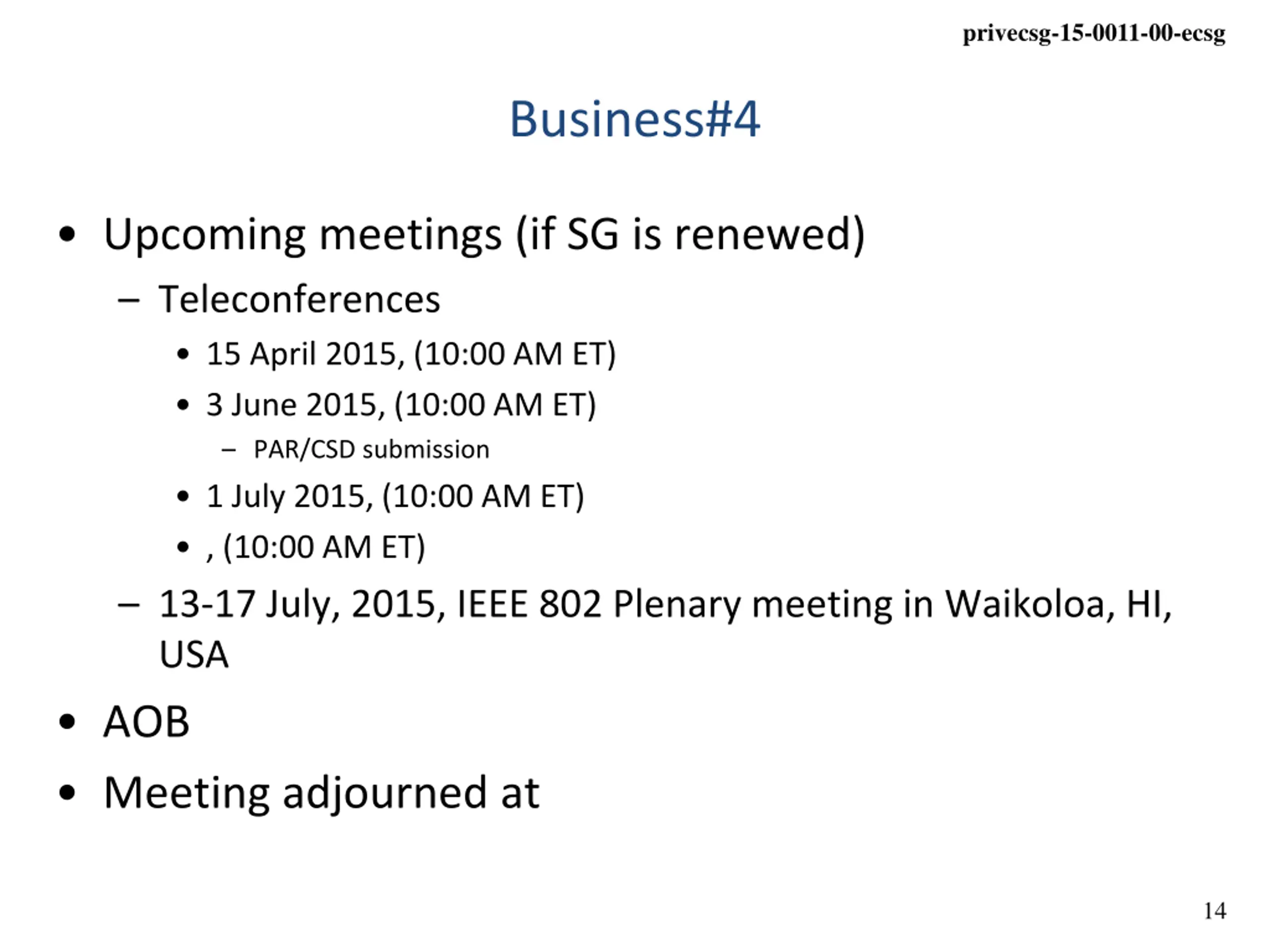 privecsg-15-0011-00-ecsg Business#4 Upcoming meetings (if SG is renewed) Teleconferences 15 April 2015, (10:00 AM ET) 3 June 2015, (10:00 AM ET) PAR/CSD submission 1 July 2015, (10:00 AM ET) , (10:00 AM ET) 13-17 July, 2015, IEEE 802 Plenary meeting in Waikoloa, HI, USA AOB Meeting adjourned at 14
