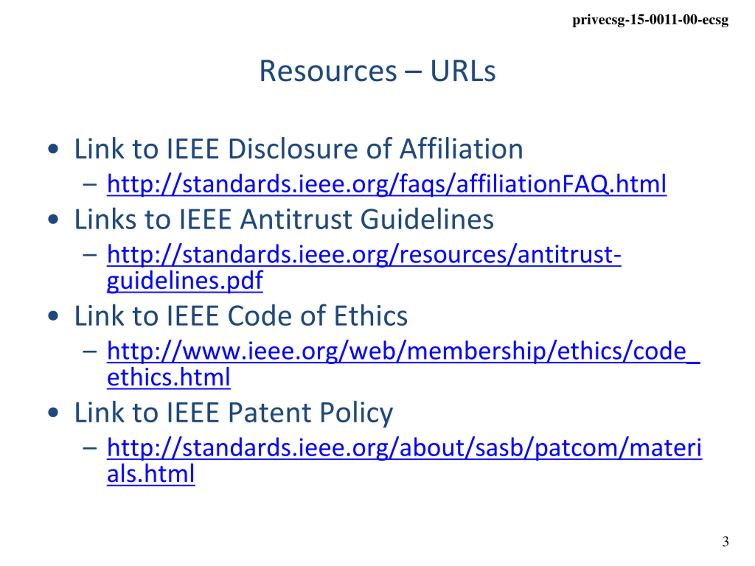 privecsg-15-0011-00-ecsg Resources URLs Link to IEEE Disclosure of Affiliation http://standards.ieee.org/faqs/affiliationFAQ.html Links to IEEE Antitrust Guidelines http://standards.ieee.org/resources/antitrust- guidelines.pdf Link to IEEE Code of Ethics http://www.ieee.org/web/membership/ethics/code_ ethics.html Link to IEEE Patent Policy http://standards.ieee.org/about/sasb/patcom/materi als.html 3
