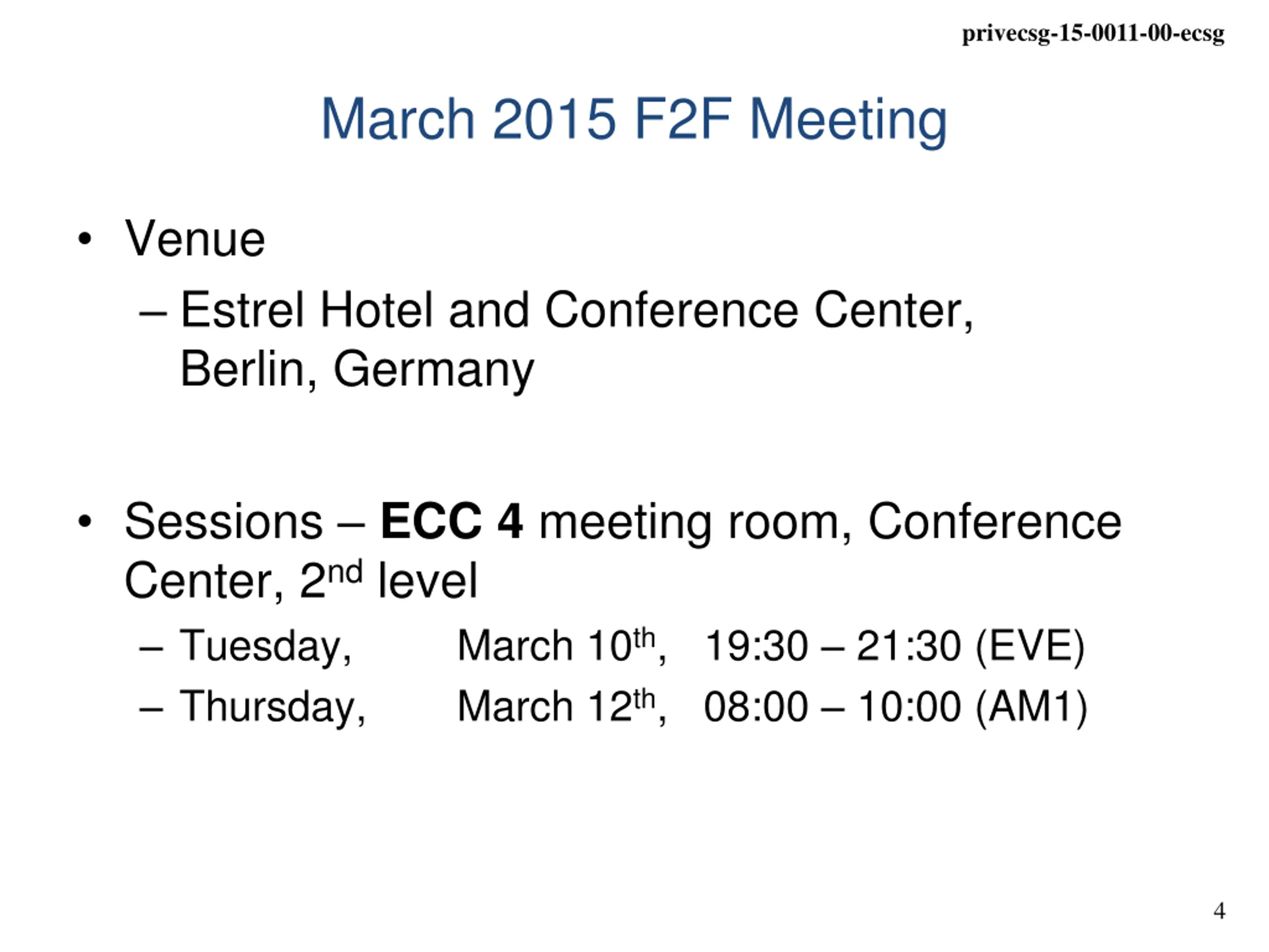 privecsg-15-0011-00-ecsg March 2015 F2F Meeting Venue Estrel Hotel and Conference Center, Berlin, Germany Sessions ECC 4 meeting room, Conference Center, 2ndlevel Tuesday, March 10th, 19:30 21:30 (EVE) Thursday, March 12th, 08:00 10:00 (AM1) 4