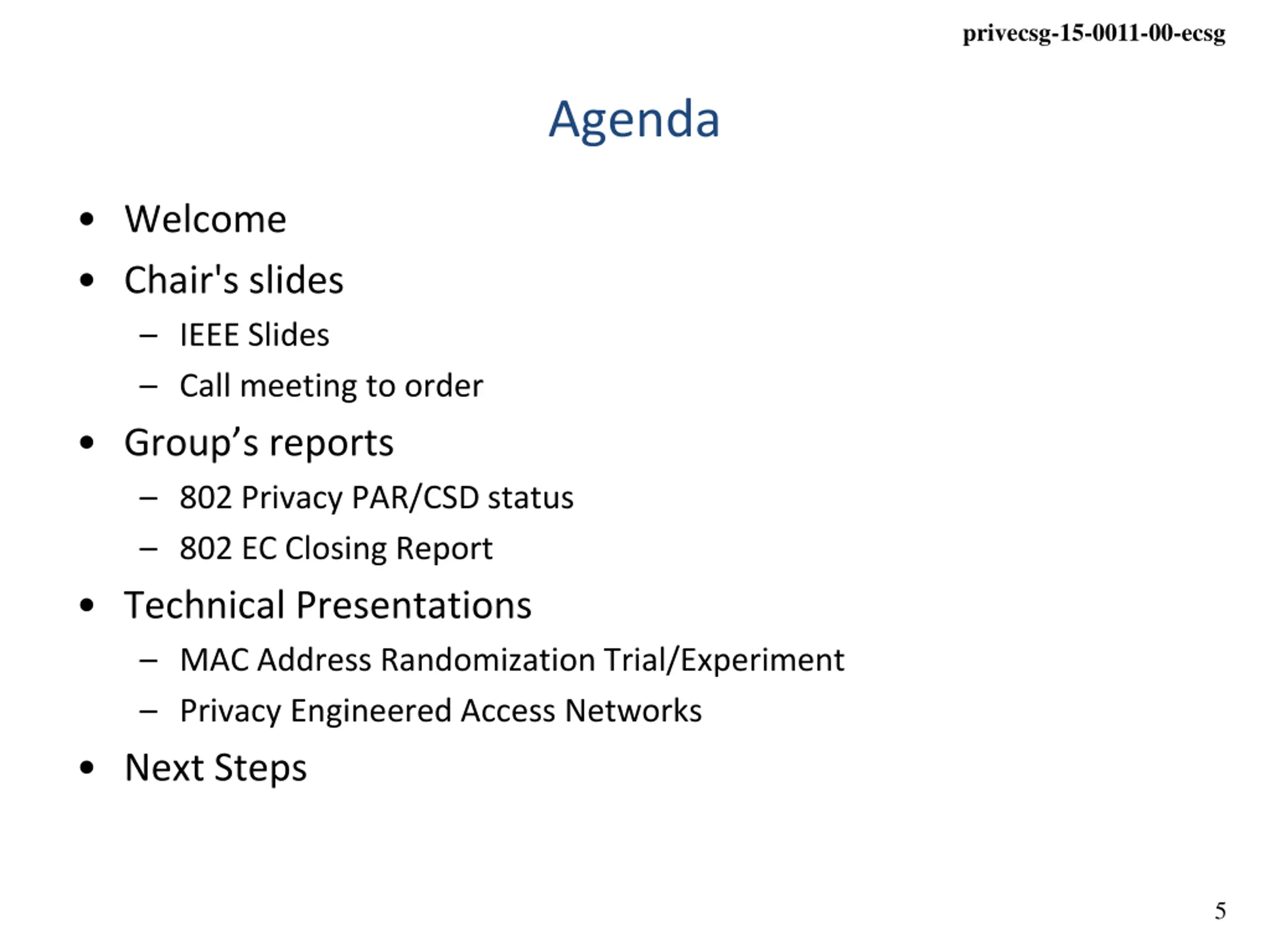 privecsg-15-0011-00-ecsg Agenda Welcome Chair's slides IEEE Slides Call meeting to order Group s reports 802 Privacy PAR/CSD status 802 EC Closing Report Technical Presentations MAC Address Randomization Trial/Experiment Privacy Engineered Access Networks Next Steps 5