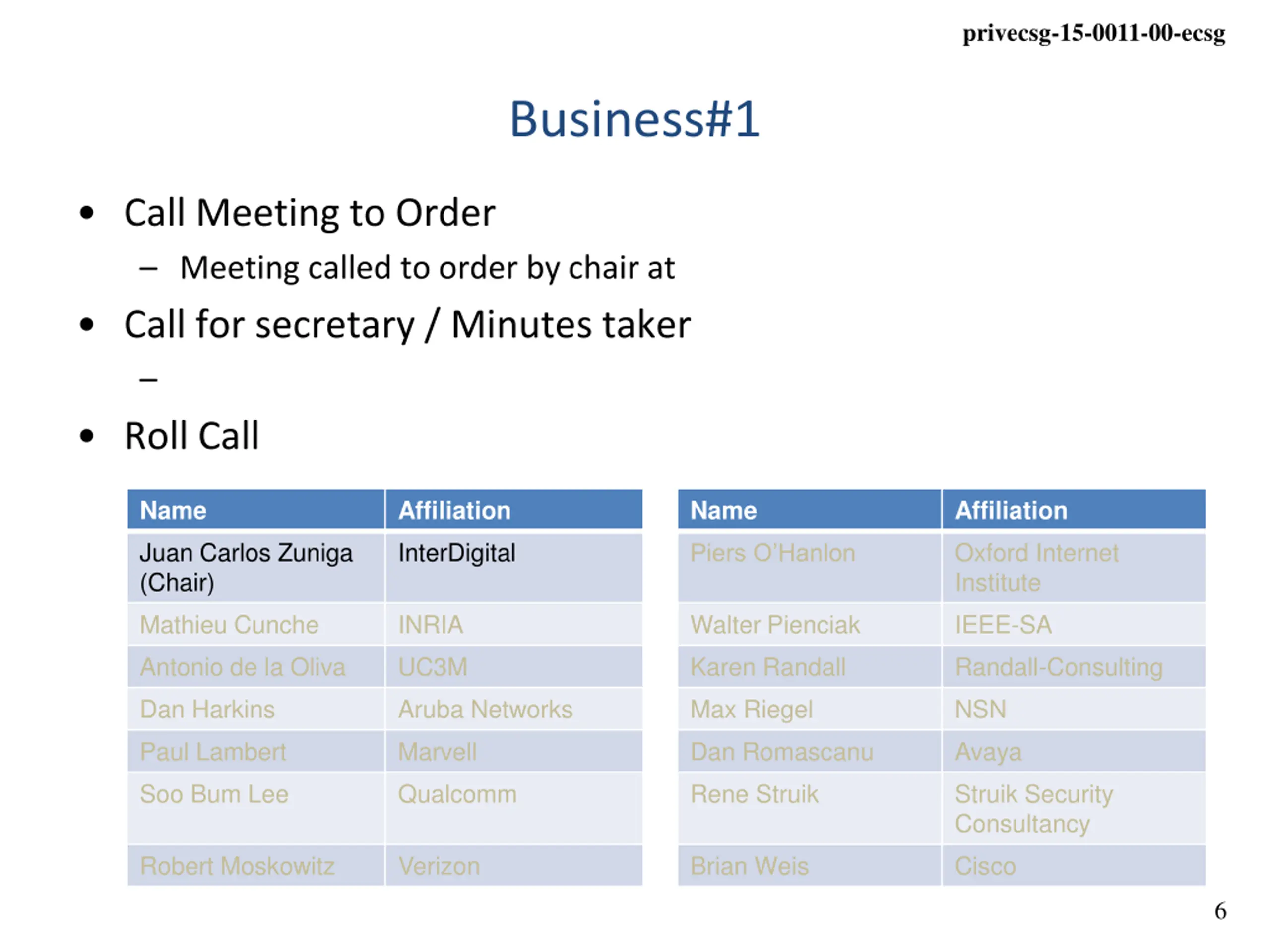 privecsg-15-0011-00-ecsg Business#1 Call Meeting to Order Meeting called to order by chair at Call for secretary / Minutes taker Roll Call Name Affiliation Name Affiliation Juan Carlos Zuniga (Chair) InterDigital Oxford Internet Institute Piers O Hanlon Mathieu Cunche INRIA Walter Pienciak IEEE-SA Antonio de la Oliva UC3M Karen Randall Randall-Consulting Dan Harkins Aruba Networks Max Riegel NSN Paul Lambert Marvell Dan Romascanu Avaya Soo Bum Lee Qualcomm Rene Struik Struik Security Consultancy Robert Moskowitz Verizon Brian Weis Cisco 6
