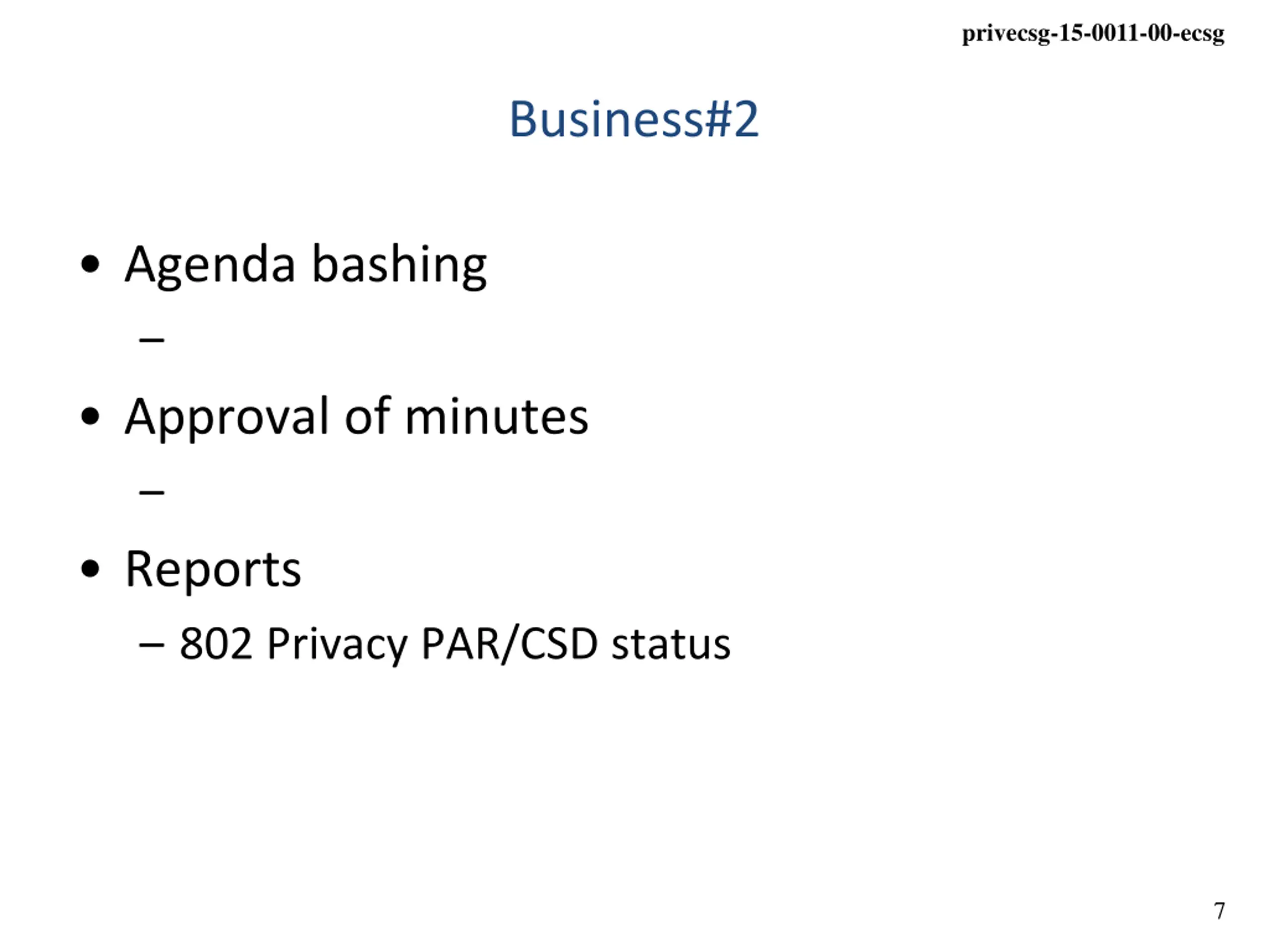 privecsg-15-0011-00-ecsg Business#2 Agenda bashing Approval of minutes Reports 802 Privacy PAR/CSD status 7