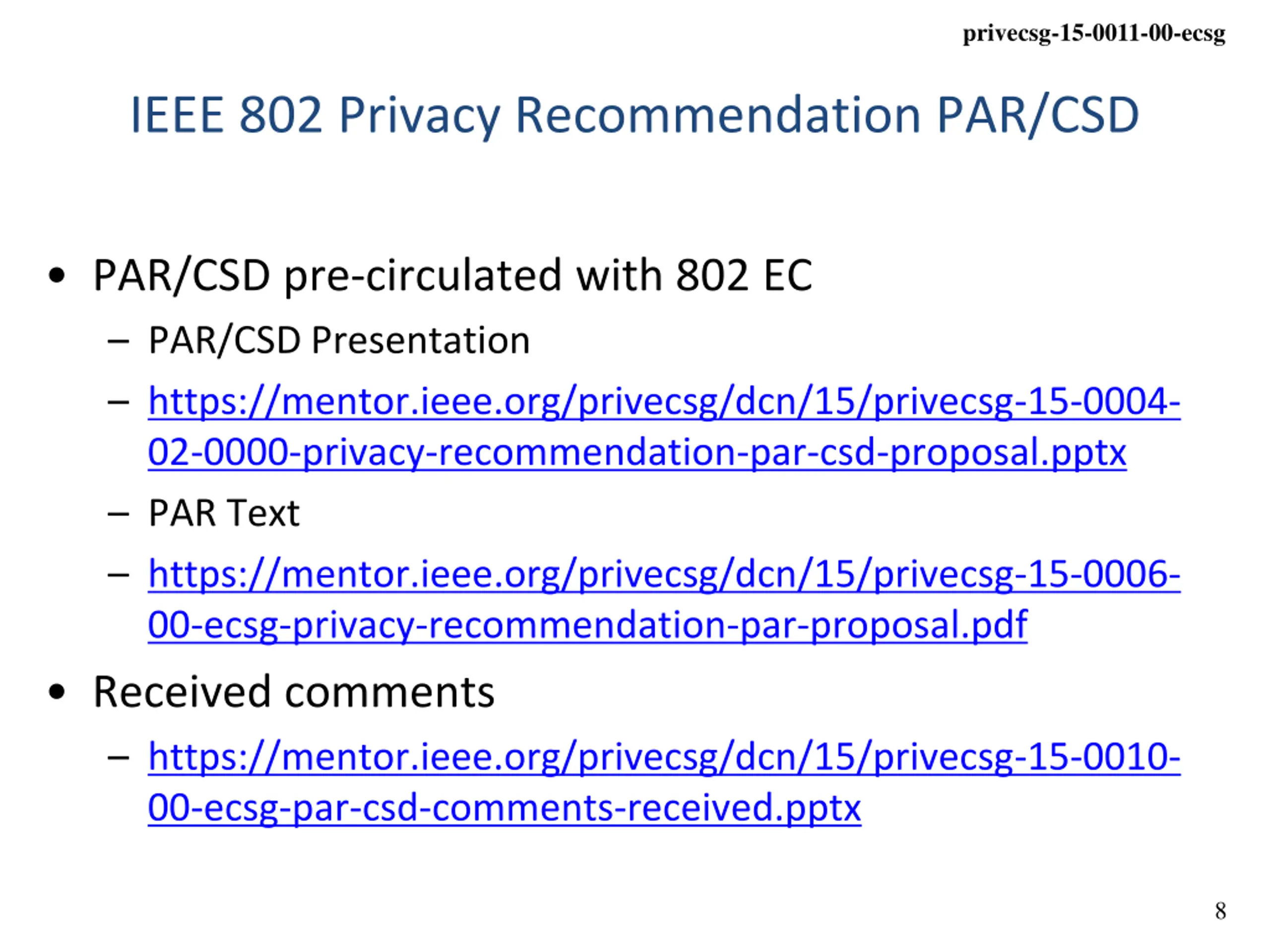 privecsg-15-0011-00-ecsg IEEE 802 Privacy Recommendation PAR/CSD PAR/CSD pre-circulated with 802 EC PAR/CSD Presentation https://mentor.ieee.org/privecsg/dcn/15/privecsg-15-0004- 02-0000-privacy-recommendation-par-csd-proposal.pptx PAR Text https://mentor.ieee.org/privecsg/dcn/15/privecsg-15-0006- 00-ecsg-privacy-recommendation-par-proposal.pdf Received comments https://mentor.ieee.org/privecsg/dcn/15/privecsg-15-0010- 00-ecsg-par-csd-comments-received.pptx 8