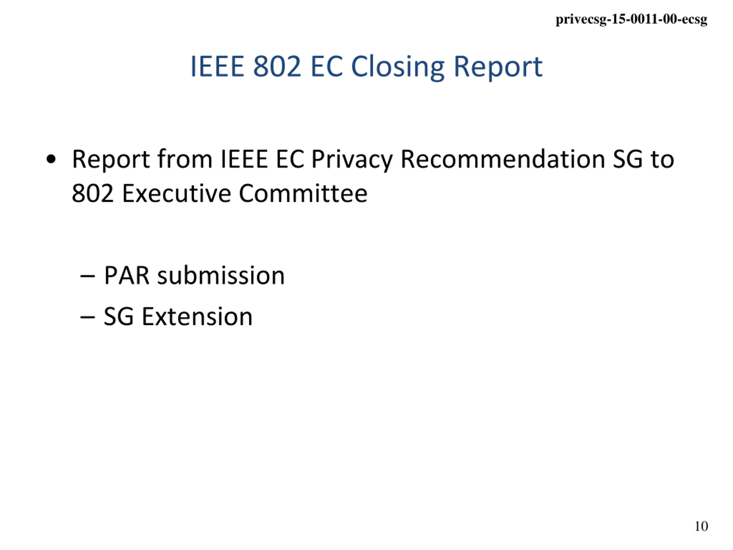 privecsg-15-0011-00-ecsg IEEE 802 EC Closing Report Report from IEEE EC Privacy Recommendation SG to 802 Executive Committee PAR submission SG Extension 10