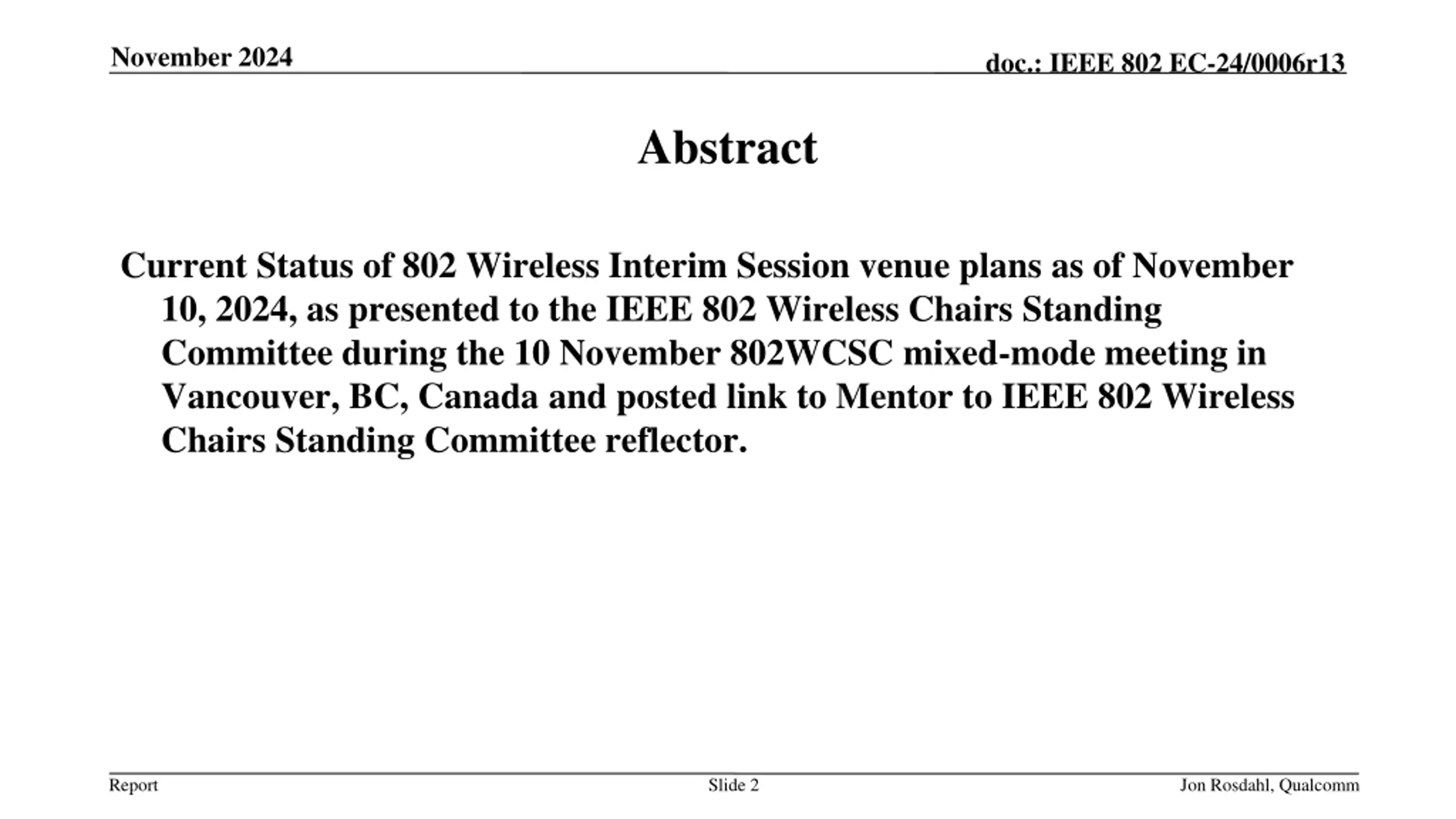 November 2024 doc.: IEEE 802 EC-24/0006r13 Abstract Current Status of 802 Wireless Interim Session venue plans as of November 10, 2024, as presented to the IEEE 802 Wireless Chairs Standing Committee during the 10 November 802WCSC mixed-mode meeting in Vancouver, BC, Canada and posted link to Mentor to IEEE 802 Wireless Chairs Standing Committee reflector. Report Slide 2 Jon Rosdahl, Qualcomm