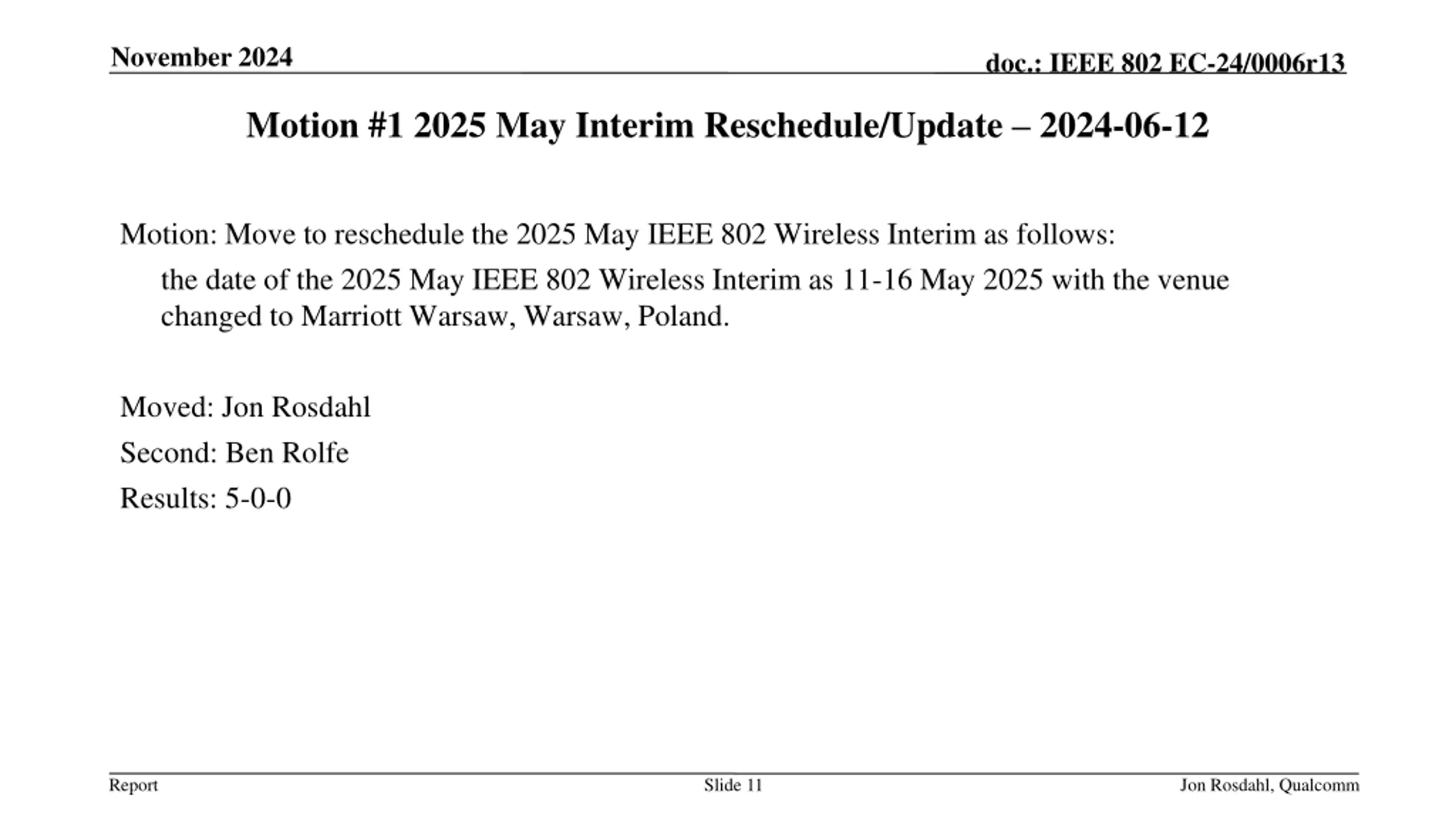 November 2024 doc.: IEEE 802 EC-24/0006r13 Motion #1 2025 May Interim Reschedule/Update 2024-06-12 Motion: Move to reschedule the 2025 May IEEE 802 Wireless Interim as follows: the date of the 2025 May IEEE 802 Wireless Interim as 11-16 May 2025 with the venue changed to Marriott Warsaw, Warsaw, Poland. Moved: Jon Rosdahl Second: Ben Rolfe Results: 5-0-0 Report Slide 11 Jon Rosdahl, Qualcomm