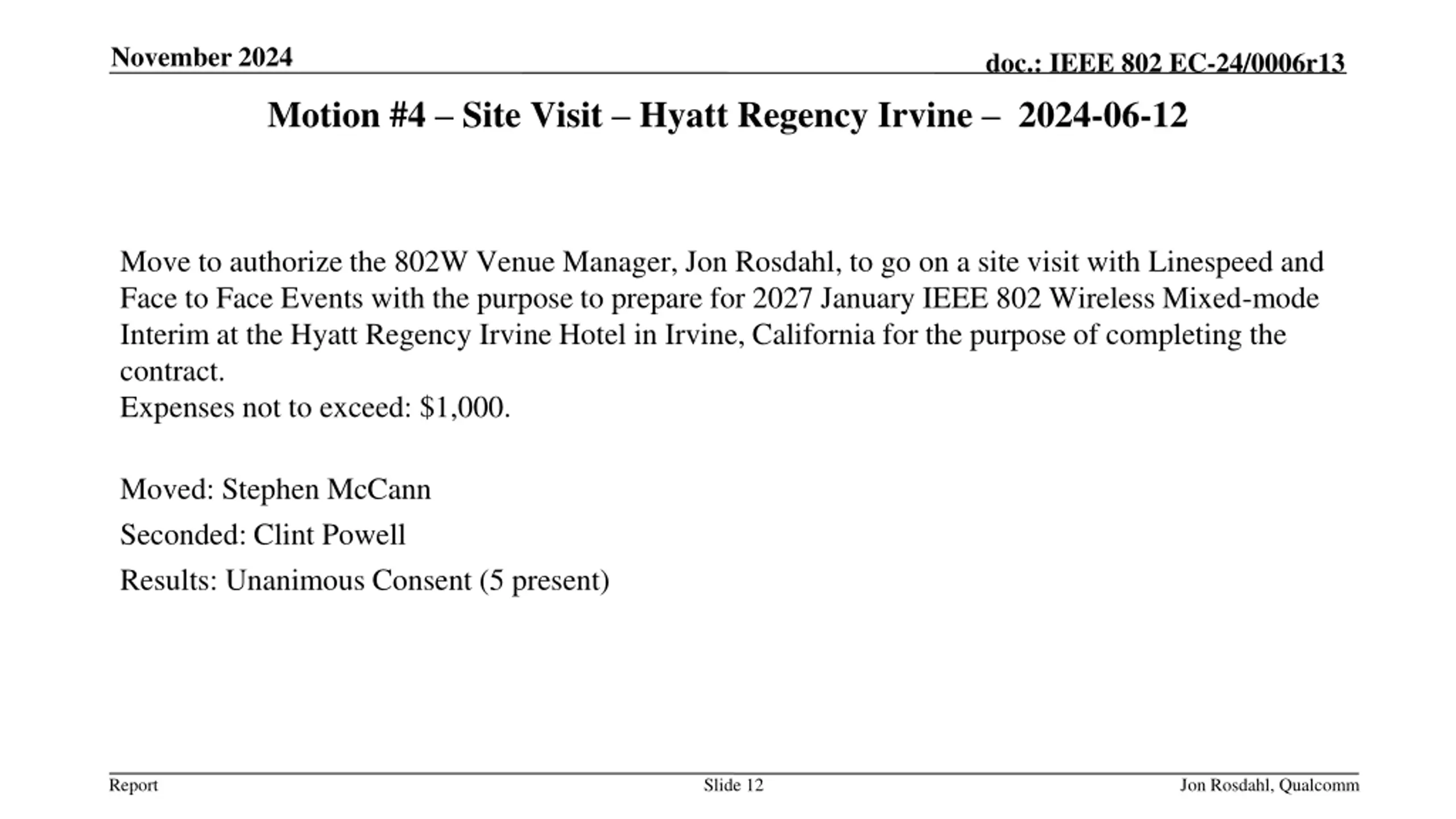 November 2024 doc.: IEEE 802 EC-24/0006r13 Motion #4 Site Visit Hyatt Regency Irvine 2024-06-12 Move to authorize the 802W Venue Manager, Jon Rosdahl, to go on a site visit with Linespeed and Face to Face Events with the purpose to prepare for 2027 January IEEE 802 Wireless Mixed-mode Interim at the Hyatt Regency Irvine Hotel in Irvine, California for the purpose of completing the contract. Expenses not to exceed: $1,000. Moved: Stephen McCann Seconded: Clint Powell Results: Unanimous Consent (5 present) Report Slide 12 Jon Rosdahl, Qualcomm