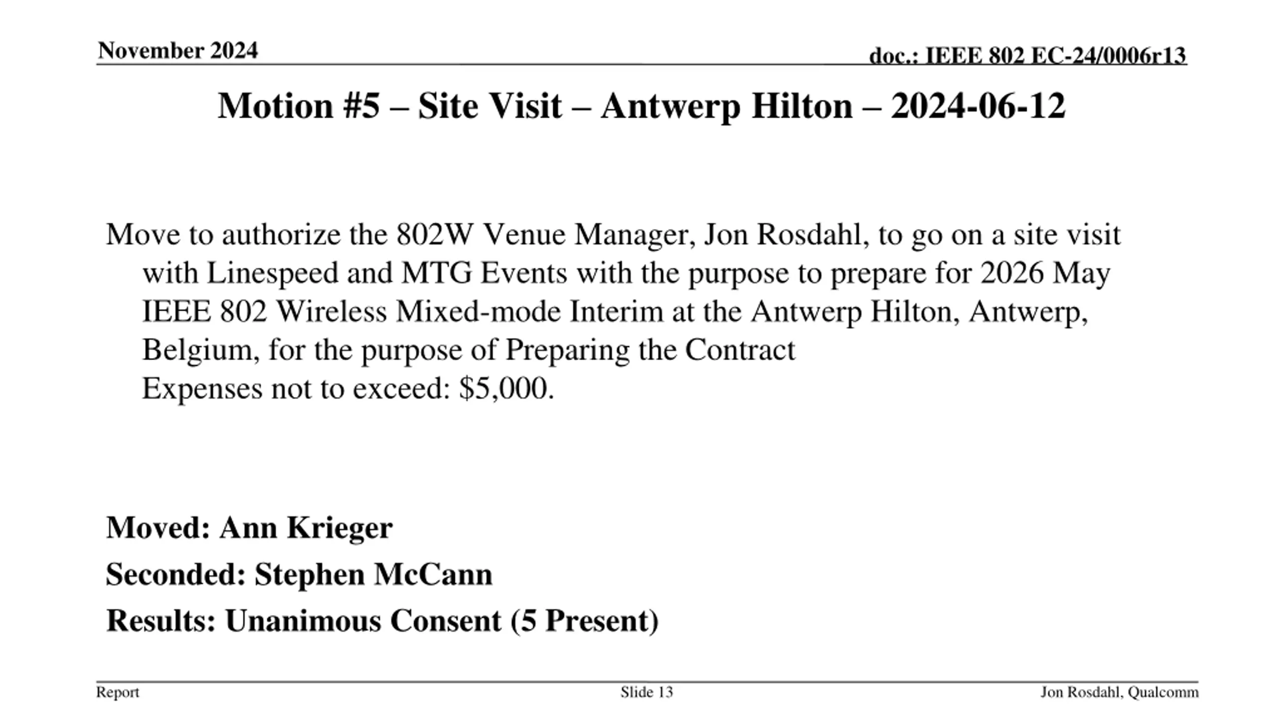 November 2024 doc.: IEEE 802 EC-24/0006r13 Motion #5 Site Visit Antwerp Hilton 2024-06-12 Move to authorize the 802W Venue Manager, Jon Rosdahl, to go on a site visit with Linespeed and MTG Events with the purpose to prepare for 2026 May IEEE 802 Wireless Mixed-mode Interim at the Antwerp Hilton, Antwerp, Belgium, for the purpose of Preparing the Contract Expenses not to exceed: $5,000. Moved: Ann Krieger Seconded: Stephen McCann Results: Unanimous Consent (5 Present) Report Slide 13 Jon Rosdahl, Qualcomm