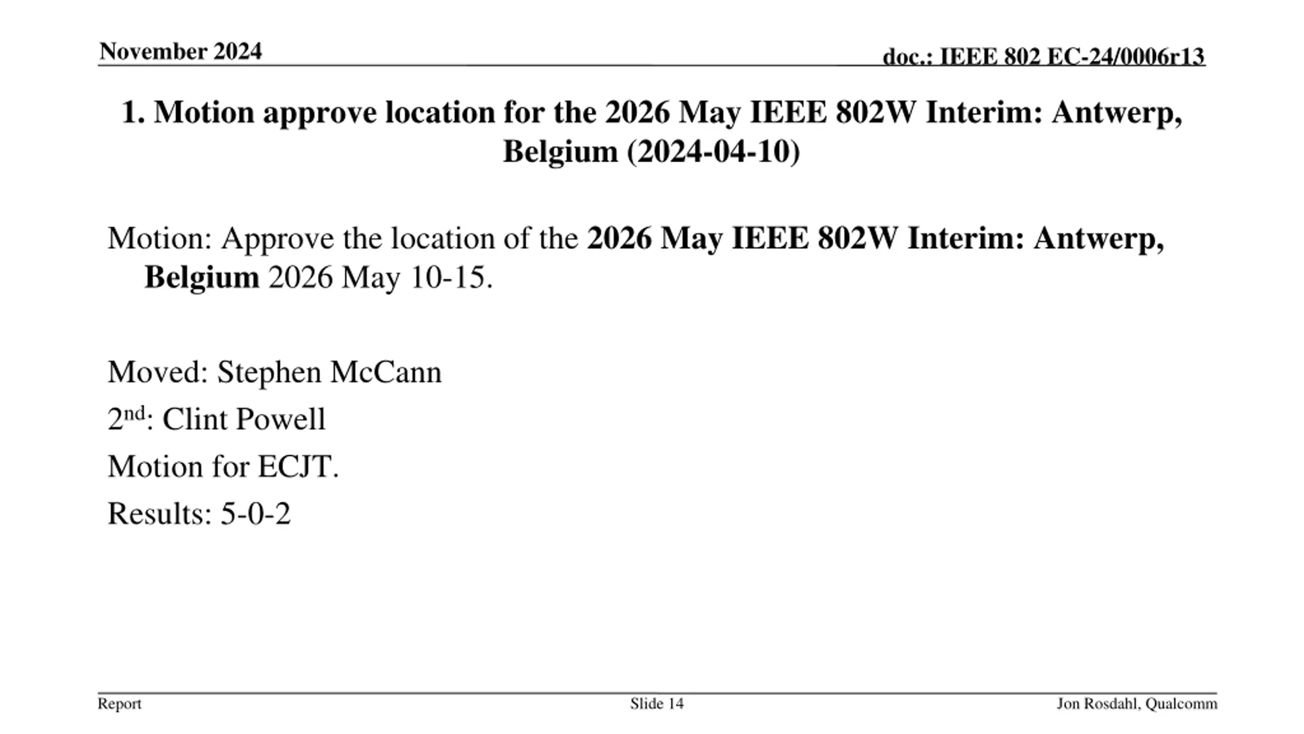 November 2024 doc.: IEEE 802 EC-24/0006r13 1. Motion approve location for the 2026 May IEEE 802W Interim: Antwerp, Belgium (2024-04-10) Motion: Approve the location of the 2026 May IEEE 802W Interim: Antwerp, Belgium 2026 May 10-15. Moved: Stephen McCann 2nd: Clint Powell Motion for ECJT. Results: 5-0-2 Report Slide 14 Jon Rosdahl, Qualcomm