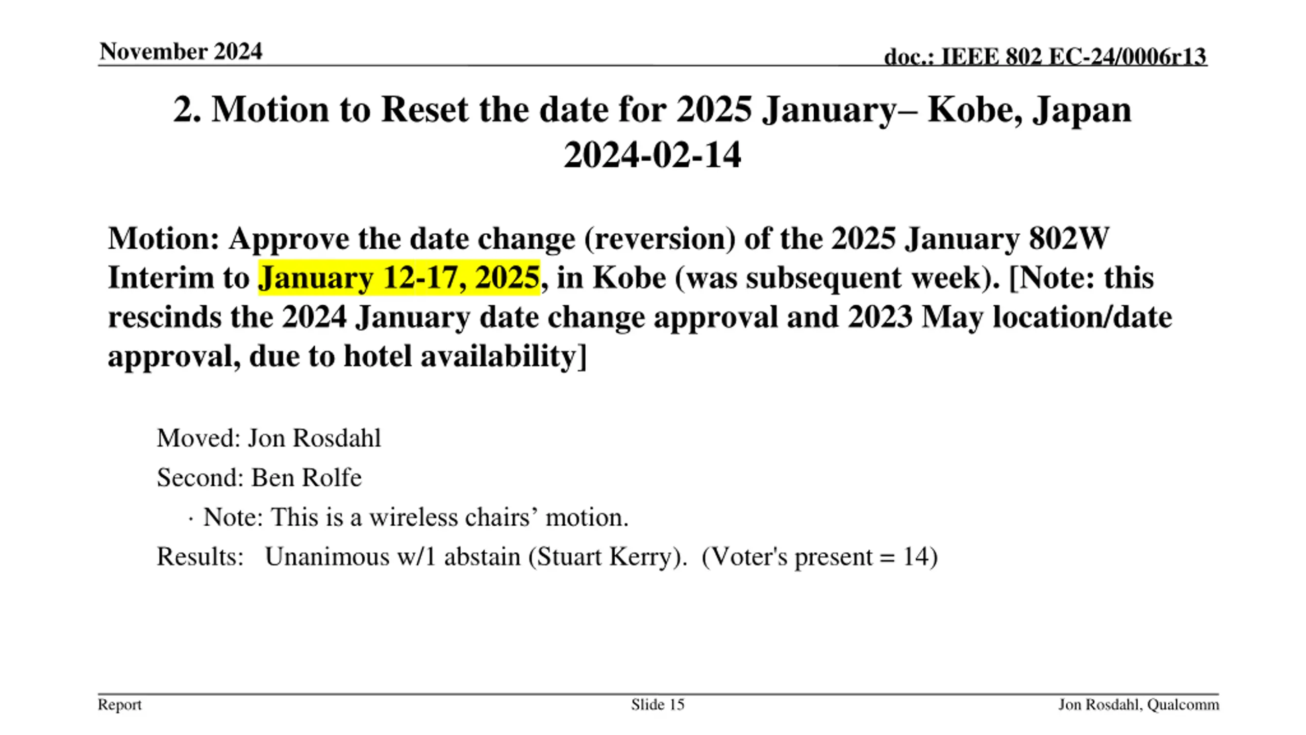 November 2024 doc.: IEEE 802 EC-24/0006r13 2. Motion to Reset the date for 2025 January Kobe, Japan 2024-02-14 Motion: Approve the date change (reversion) of the 2025 January 802W Interim to January 12-17, 2025, in Kobe (was subsequent week). [Note: this rescinds the 2024 January date change approval and 2023 May location/date approval, due to hotel availability] Moved: Jon Rosdahl Second: Ben Rolfe Note: This is a wireless chairs motion. Results: Unanimous w/1 abstain (Stuart Kerry). (Voter's present = 14) Report Slide 15 Jon Rosdahl, Qualcomm