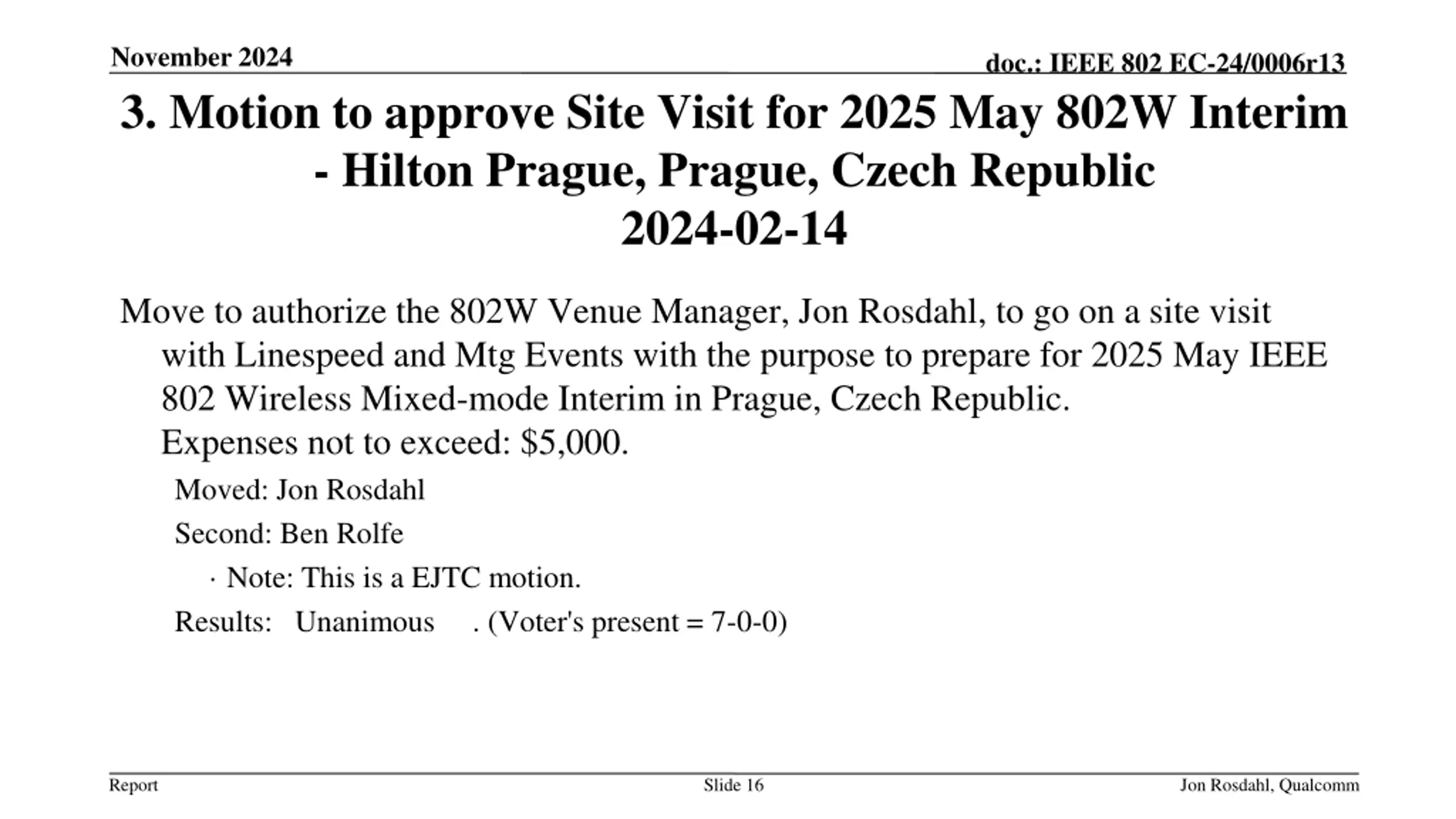 November 2024 doc.: IEEE 802 EC-24/0006r13 3. Motion to approve Site Visit for 2025 May 802W Interim - Hilton Prague, Prague, Czech Republic 2024-02-14 Move to authorize the 802W Venue Manager, Jon Rosdahl, to go on a site visit with Linespeed and Mtg Events with the purpose to prepare for 2025 May IEEE 802 Wireless Mixed-mode Interim in Prague, Czech Republic. Expenses not to exceed: $5,000. Moved: Jon Rosdahl Second: Ben Rolfe Note: This is a EJTC motion. Results: Unanimous . (Voter's present = 7-0-0) Report Slide 16 Jon Rosdahl, Qualcomm