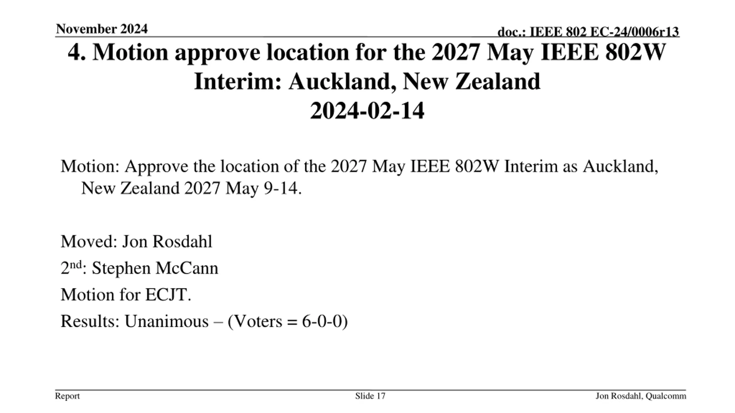 November 2024 doc.: IEEE 802 EC-24/0006r13 4. Motion approve location for the 2027 May IEEE 802W Interim: Auckland, New Zealand 2024-02-14 Motion: Approve the location of the 2027 May IEEE 802W Interim as Auckland, New Zealand 2027 May 9-14. Moved: Jon Rosdahl 2nd: Stephen McCann Motion for ECJT. Results: Unanimous (Voters = 6-0-0) Report Slide 17 Jon Rosdahl, Qualcomm