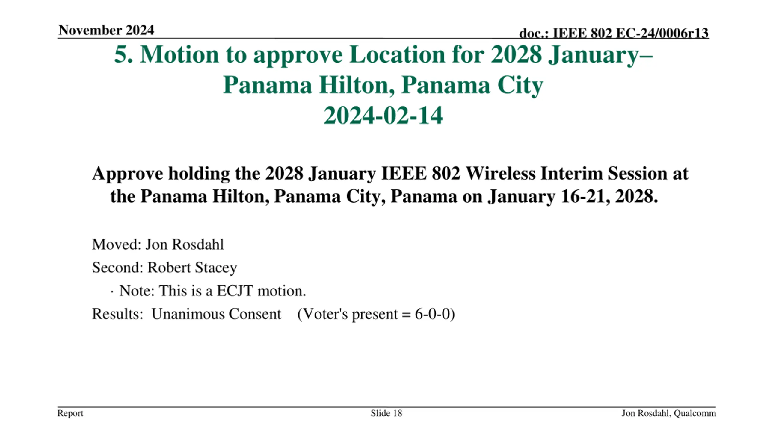 November 2024 doc.: IEEE 802 EC-24/0006r13 5. Motion to approve Location for 2028 January Panama Hilton, Panama City 2024-02-14 Approve holding the 2028 January IEEE 802 Wireless Interim Session at the Panama Hilton, Panama City, Panama on January 16-21, 2028. Moved: Jon Rosdahl Second: Robert Stacey Note: This is a ECJT motion. Results: Unanimous Consent (Voter's present = 6-0-0) Report Slide 18 Jon Rosdahl, Qualcomm