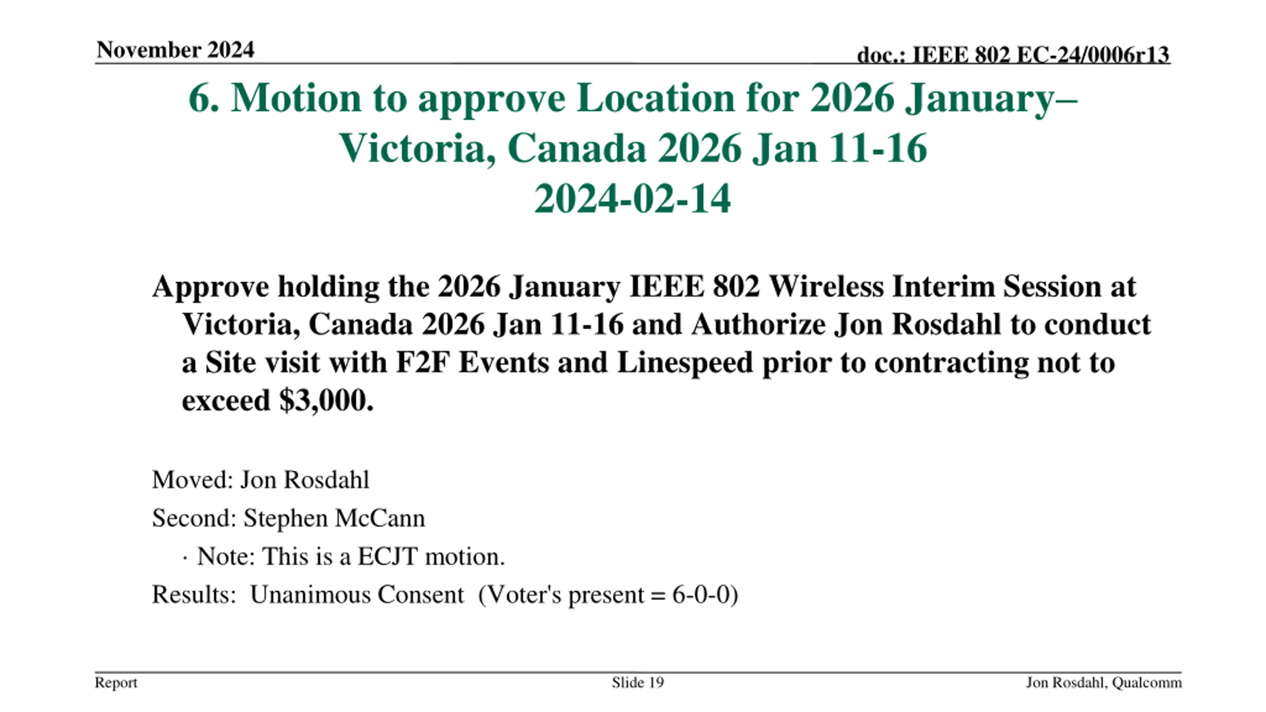 November 2024 doc.: IEEE 802 EC-24/0006r13 6. Motion to approve Location for 2026 January Victoria, Canada 2026 Jan 11-16 2024-02-14 Approve holding the 2026 January IEEE 802 Wireless Interim Session at Victoria, Canada 2026 Jan 11-16 and Authorize Jon Rosdahl to conduct a Site visit with F2F Events and Linespeed prior to contracting not to exceed $3,000. Moved: Jon Rosdahl Second: Stephen McCann Note: This is a ECJT motion. Results: Unanimous Consent (Voter's present = 6-0-0) Report Slide 19 Jon Rosdahl, Qualcomm
