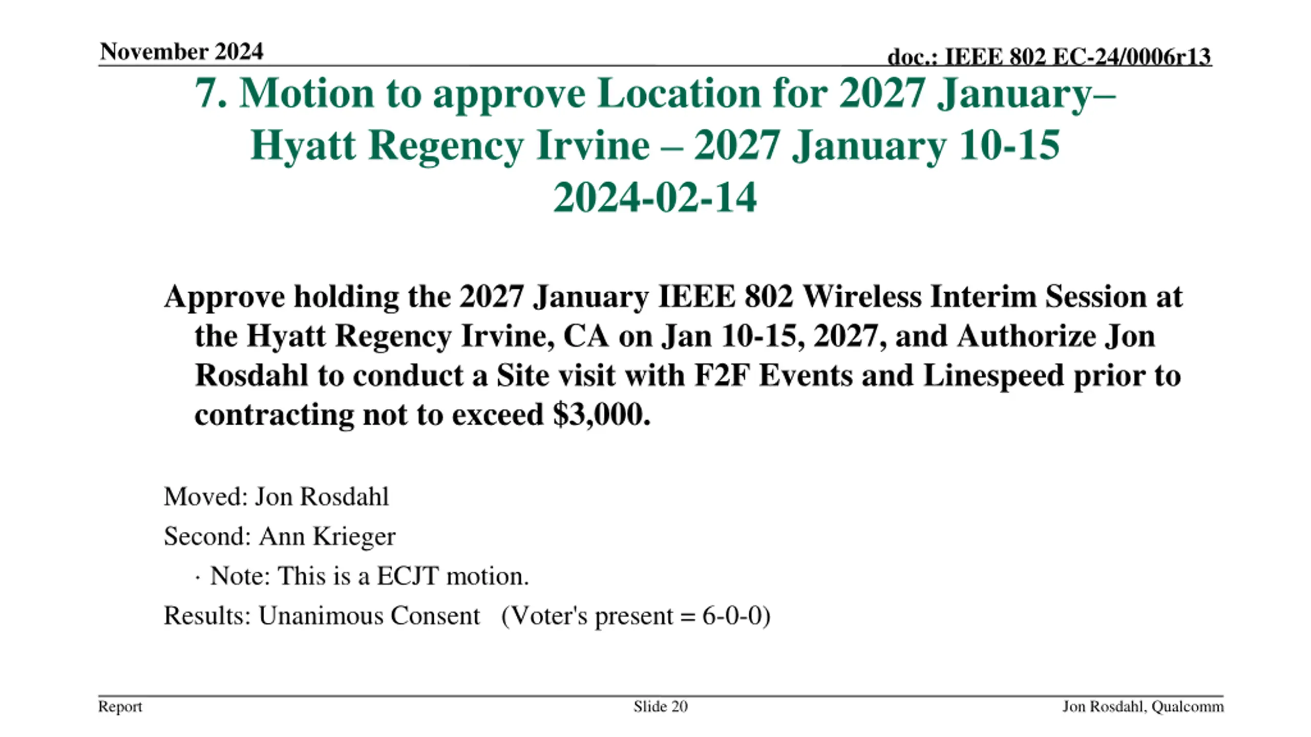 November 2024 doc.: IEEE 802 EC-24/0006r13 7. Motion to approve Location for 2027 January Hyatt Regency Irvine 2027 January 10-15 2024-02-14 Approve holding the 2027 January IEEE 802 Wireless Interim Session at the Hyatt Regency Irvine, CA on Jan 10-15, 2027, and Authorize Jon Rosdahl to conduct a Site visit with F2F Events and Linespeed prior to contracting not to exceed $3,000. Moved: Jon Rosdahl Second: Ann Krieger Note: This is a ECJT motion. Results: Unanimous Consent (Voter's present = 6-0-0) Report Slide 20 Jon Rosdahl, Qualcomm