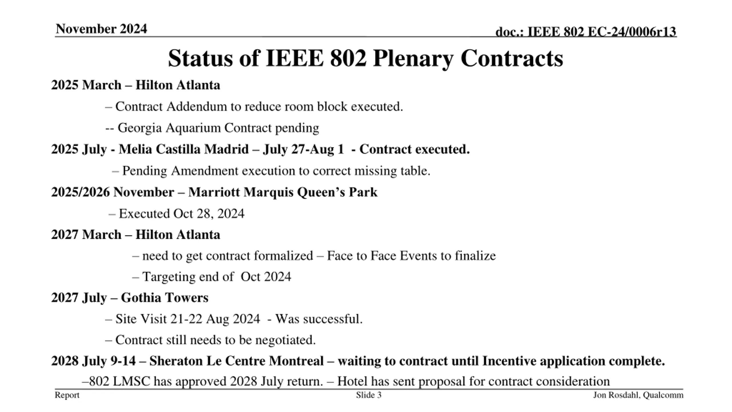 November 2024 doc.: IEEE 802 EC-24/0006r13 Status of IEEE 802 Plenary Contracts 2025 March Hilton Atlanta Contract Addendum to reduce room block executed. -- Georgia Aquarium Contract pending 2025 July - Melia Castilla Madrid July 27-Aug 1 - Contract executed. Pending Amendment execution to correct missing table. 2025/2026 November Marriott Marquis Queen s Park Executed Oct 28, 2024 2027 March Hilton Atlanta need to get contract formalized Face to Face Events to finalize Targeting end of Oct 2024 2027 July Gothia Towers Site Visit 21-22 Aug 2024 - Was successful. Contract still needs to be negotiated. 2028 July 9-14 Sheraton Le Centre Montreal waiting to contract until Incentive application complete. 802 LMSC has approved 2028 July return. Hotel has sent proposal for contract consideration Slide 3 Report Jon Rosdahl, Qualcomm