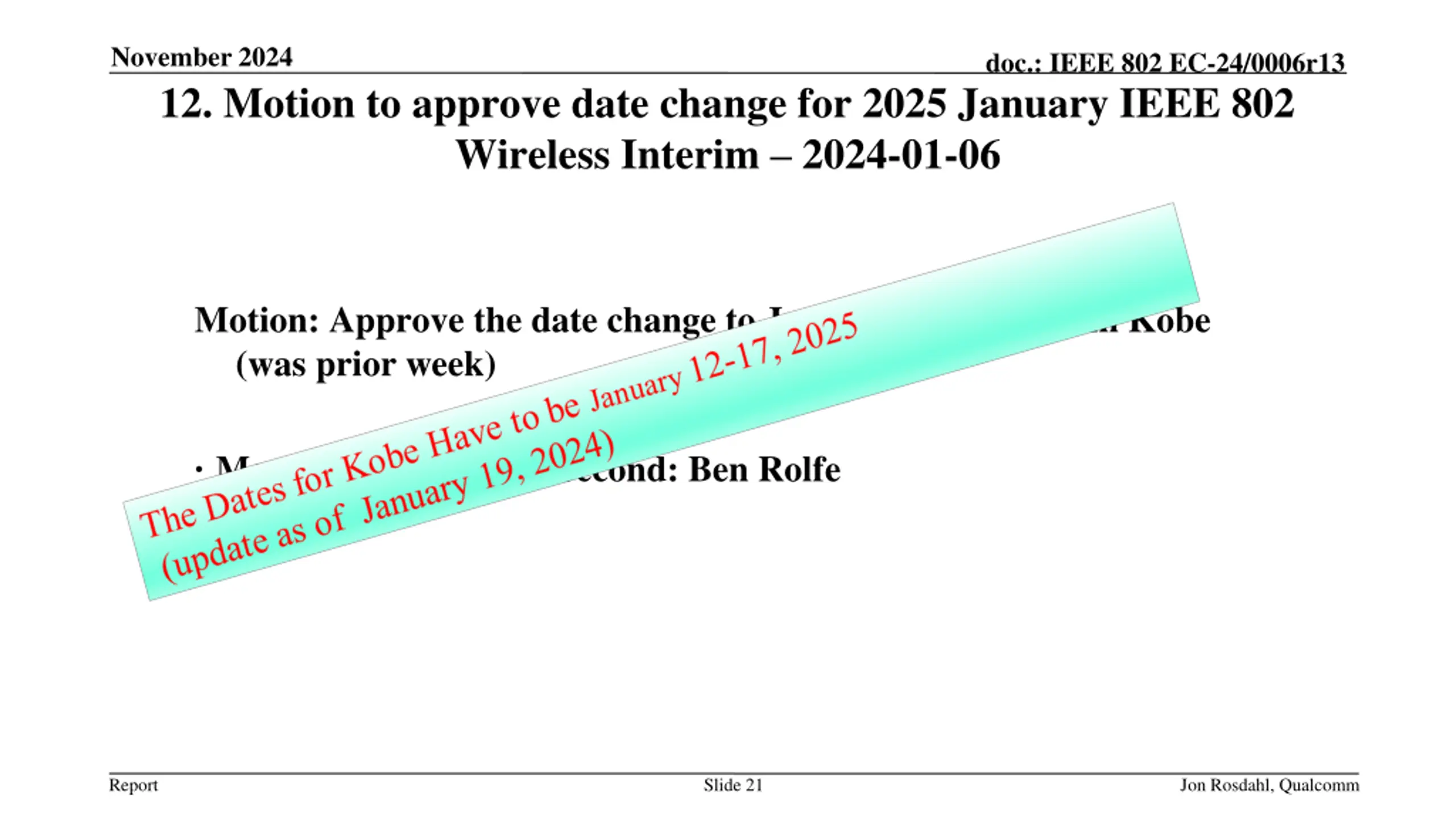 November 2024 doc.: IEEE 802 EC-24/0006r13 12. Motion to approve date change for 2025 January IEEE 802 Wireless Interim 2024-01-06 Motion: Approve the date change to January 19-24, 2025 in Kobe (was prior week) Moved: Jon Rosdahl, Second: Ben Rolfe Report Slide 21 Jon Rosdahl, Qualcomm