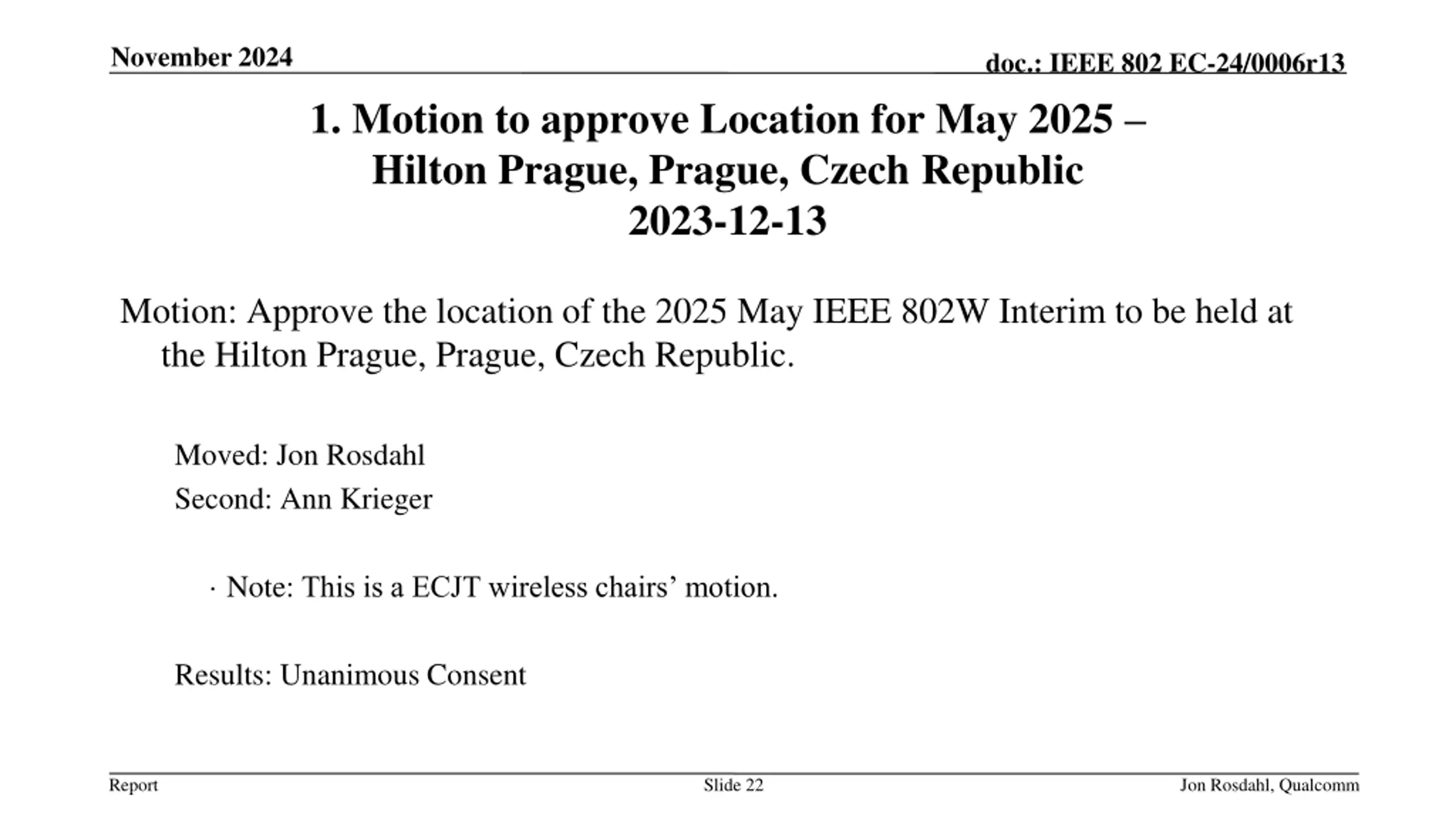 November 2024 doc.: IEEE 802 EC-24/0006r13 1. Motion to approve Location for May 2025 Hilton Prague, Prague, Czech Republic 2023-12-13 Motion: Approve the location of the 2025 May IEEE 802W Interim to be held at the Hilton Prague, Prague, Czech Republic. Moved: Jon Rosdahl Second: Ann Krieger Note: This is a ECJT wireless chairs motion. Results: Unanimous Consent Report Slide 22 Jon Rosdahl, Qualcomm