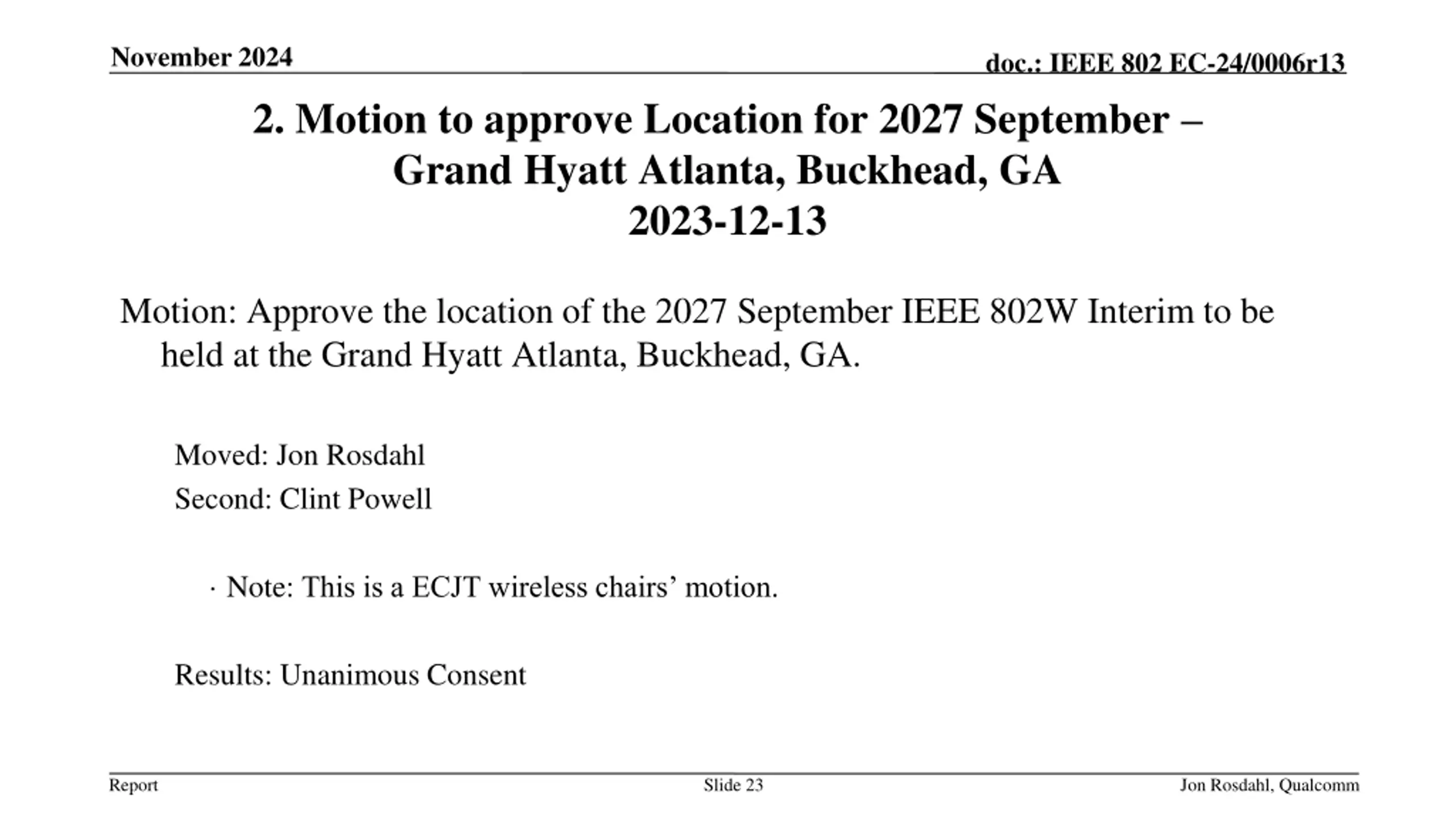 November 2024 doc.: IEEE 802 EC-24/0006r13 2. Motion to approve Location for 2027 September Grand Hyatt Atlanta, Buckhead, GA 2023-12-13 Motion: Approve the location of the 2027 September IEEE 802W Interim to be held at the Grand Hyatt Atlanta, Buckhead, GA. Moved: Jon Rosdahl Second: Clint Powell Note: This is a ECJT wireless chairs motion. Results: Unanimous Consent Report Slide 23 Jon Rosdahl, Qualcomm